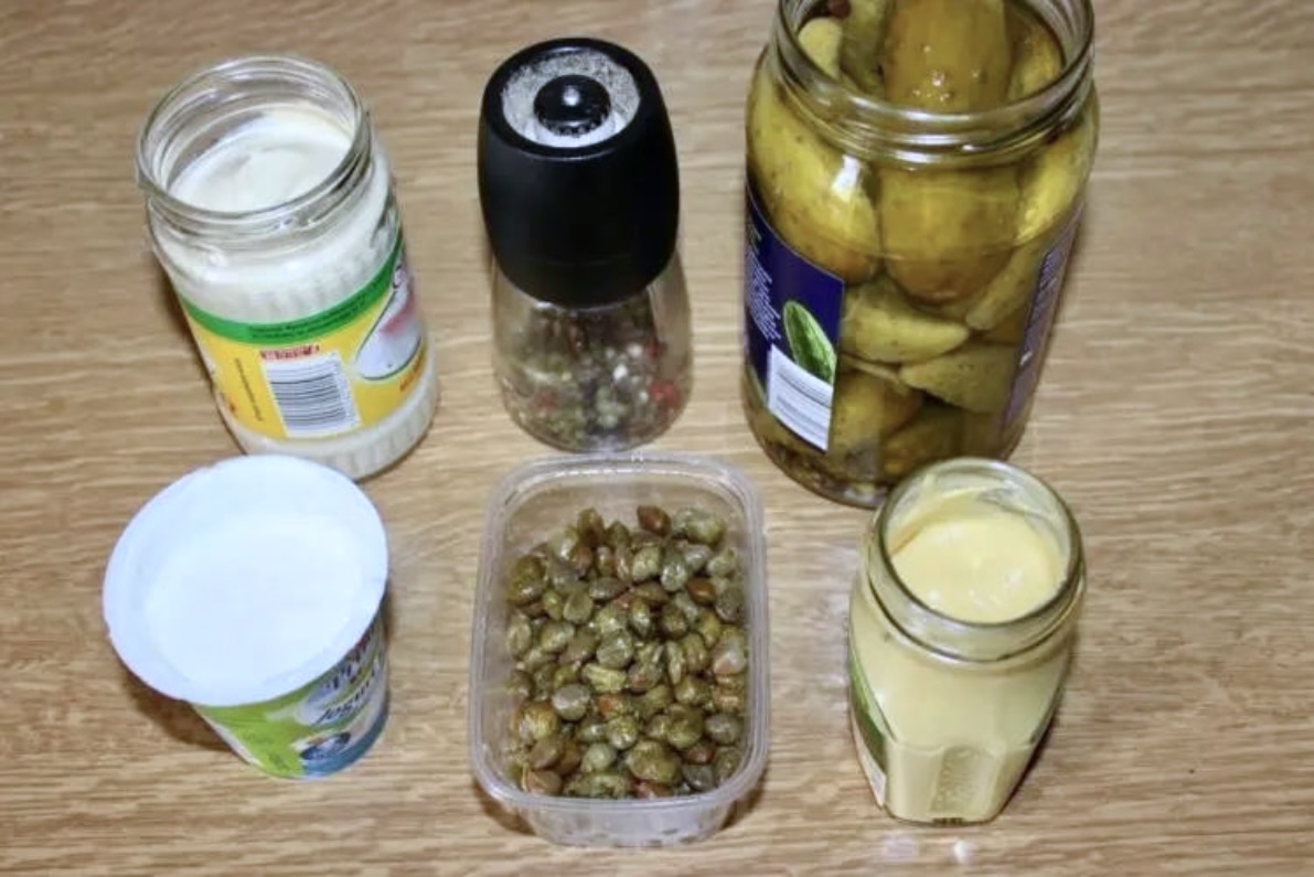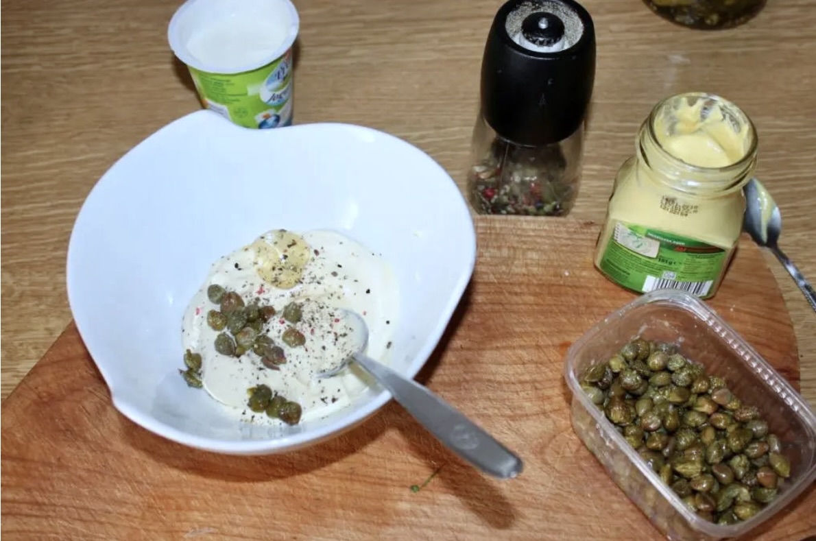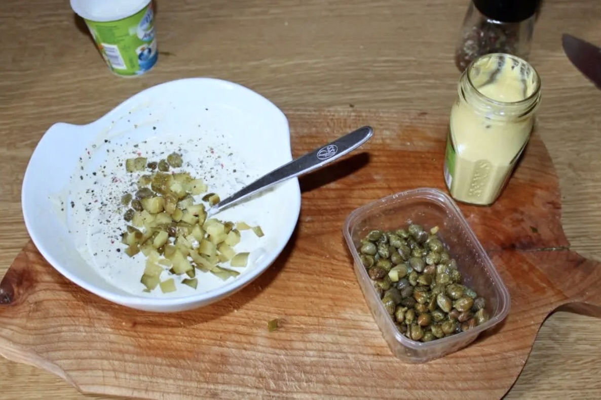 Dodatki: Ogórki konserwowe (lub korniszony) posiekaj w drobną kostkę. Dodaj je do majonezu razem z kaparami.