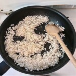 Smażenie ryżu (Soffritto i Tostatura): Posiekaj szalotkę (lub białą część dymki) i zeszklij ją na oliwie. Następnie wsyp ryż i smaż go ze szalotką na średnim ogniu, często mieszając, aż stanie się przezroczysty („zeszkli się”).