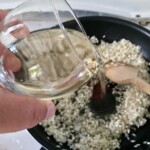 Dodanie wina: Wlej białe wino i zwiększ ogień, aby niemal całkowicie odparowało.