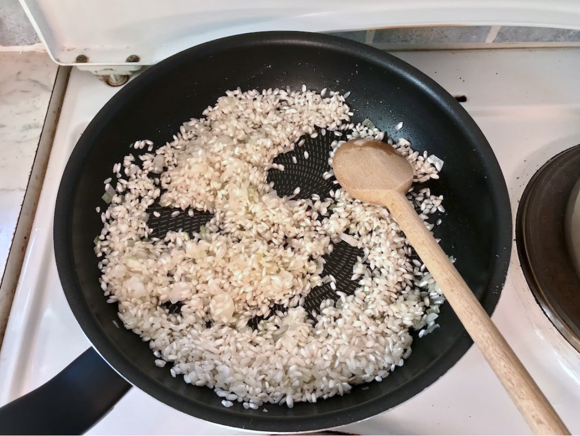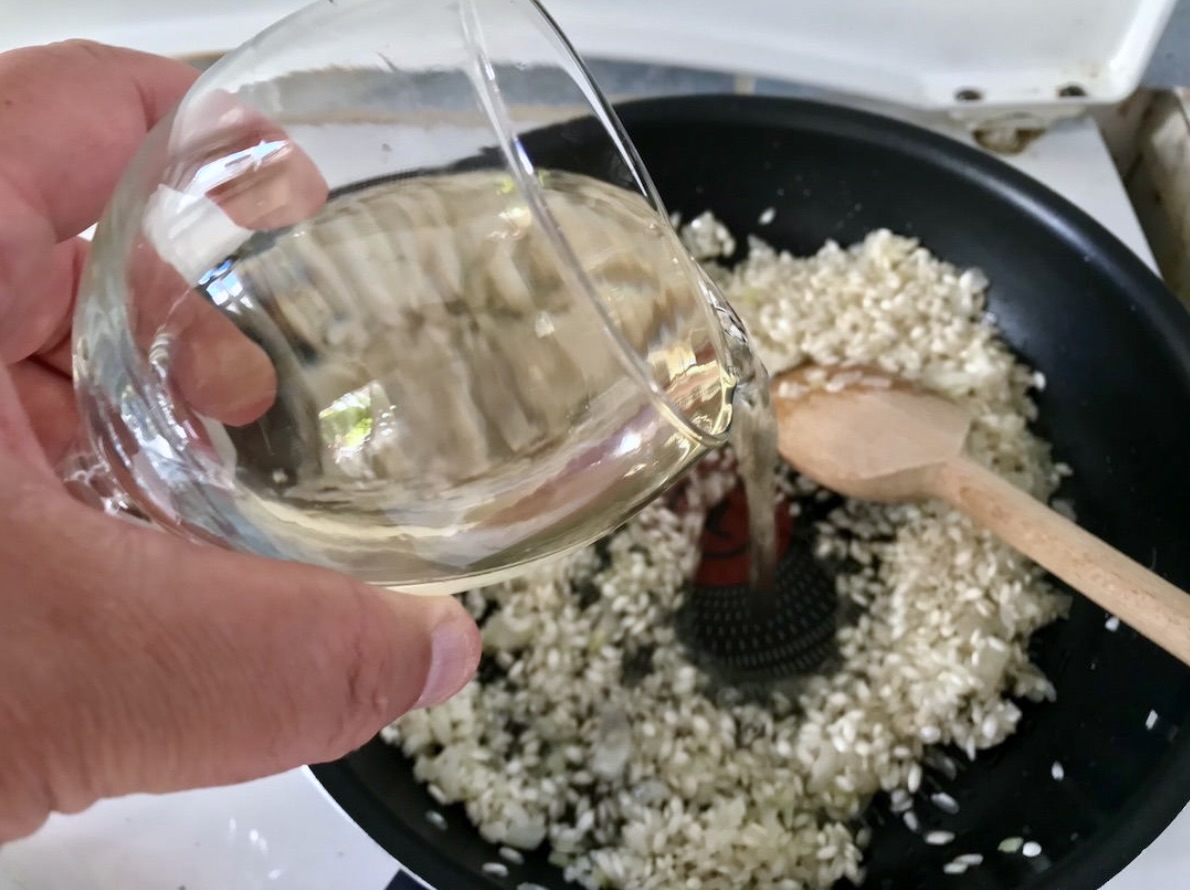 Smażenie ryżu (Soffritto i Tostatura): Posiekaj szalotkę (lub białą część dymki) i zeszklij ją na oliwie. Następnie wsyp ryż i smaż go ze szalotką na średnim ogniu, często mieszając, aż stanie się przezroczysty („zeszkli się”).