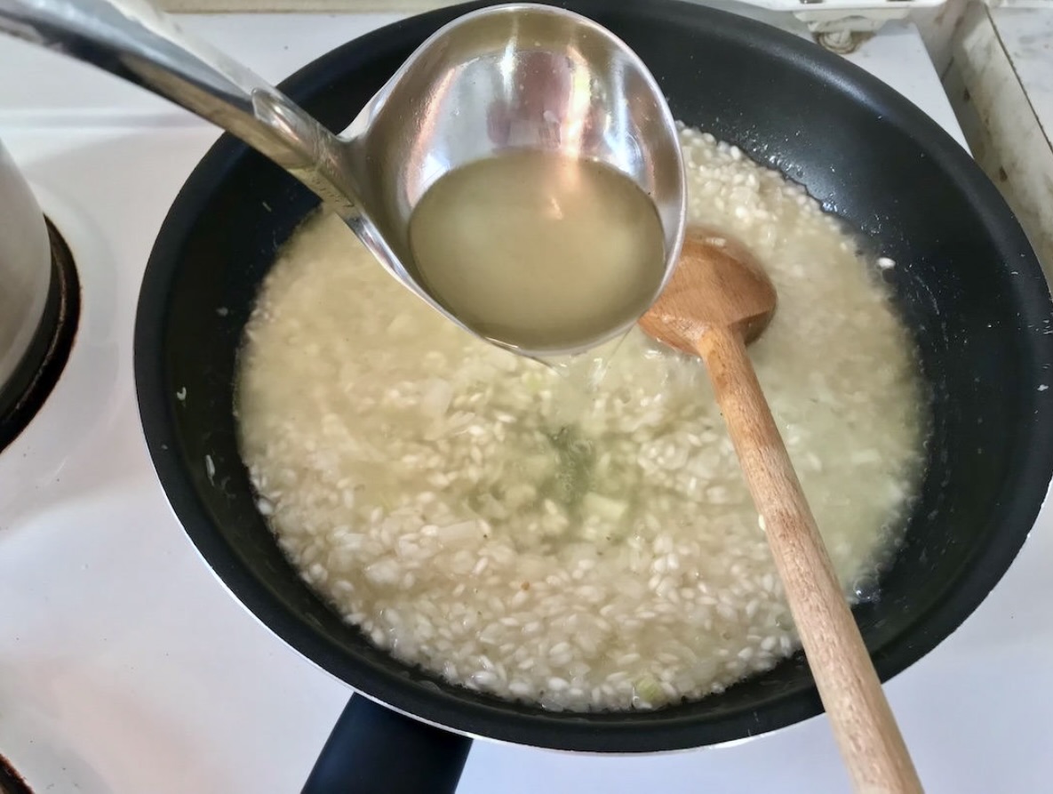 Gotowanie z bulionem: Wlej chochlę gorącego bulionu. Gotuj na małym ogniu, często mieszając. Gdy ryż niemal całkowicie wchłonie bulion, dolewaj kolejną chochlę. Bulion musi być cały czas gorący.