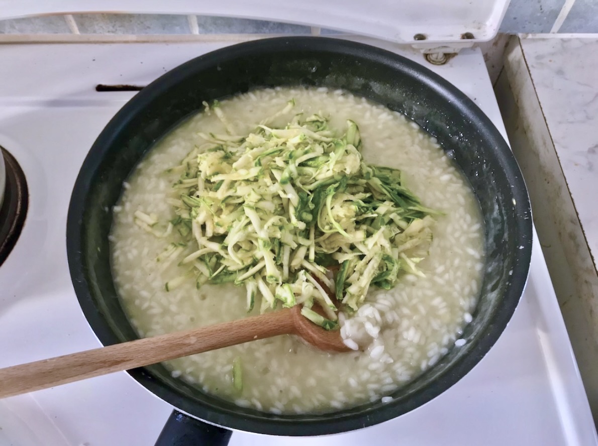 Dodanie cukinii: Po około 15 minutach, gdy ryż jest „al dente” (miękki, ale stawia opór), dodaj startą na dużych oczkach cukinię oraz ewentualnie listki mięty i płatki chilli. Gotuj całość przez 3 minuty.
