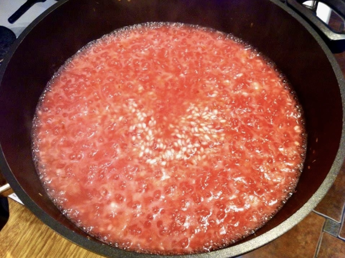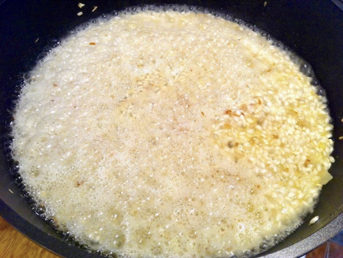 Gotowanie risotto: Wlewaj na patelnię gorący wywar z czereśni, po jednej chochelce, mieszając. Czekaj, aż płyn odparuje, i powtarzaj tę czynność, aż ryż będzie al dente. Wywar powinien być cały czas gorący.
