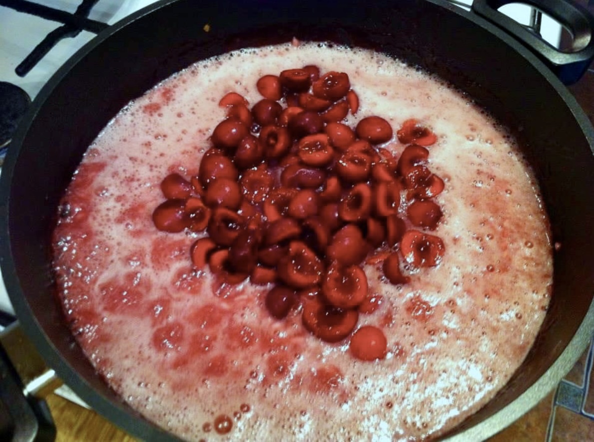 Dodanie czereśni: Wlej kolejny kieliszek wina musującego i wrzuć świeże, wydrylowane czereśnie. Mieszaj do odparowania płynów.