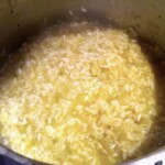 Ryż: Zwiększ płomień i wrzuć ryż arborio do soffritto. Smaż przez kilka minut, aby ryż się zeszklił.