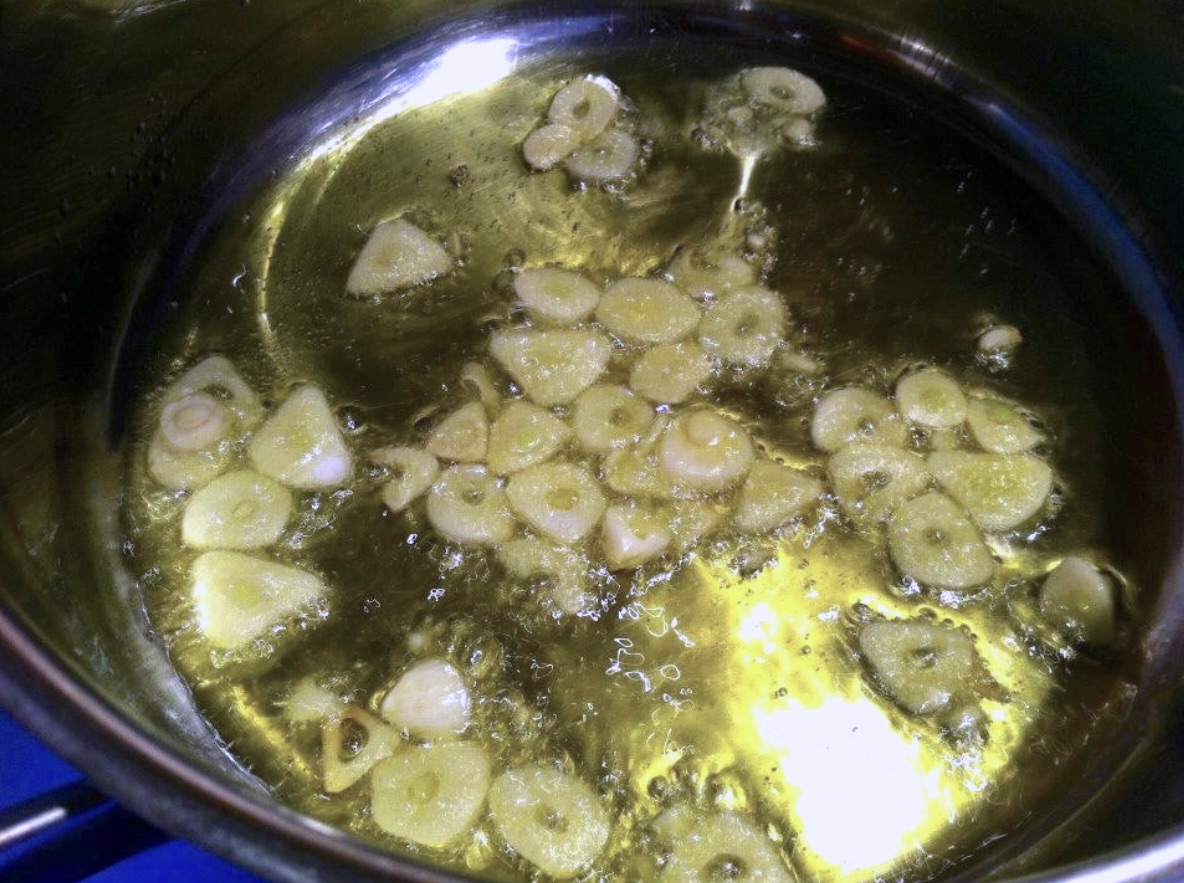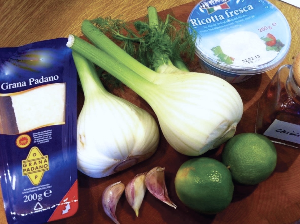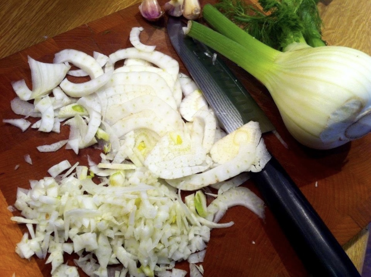 Fenkuł: Drobno posiekaj bulwę fenkuła. Na patelni rozgrzej oliwę i masło. Podsmaż 3 pokrojone w plasterki ząbki czosnku (nie dłużej niż 1 minutę). Dodaj posiekany fenkuł i duś pod przykryciem około 15 minut, podlewając niewielką ilością wody, jeśli zajdzie taka potrzeba.