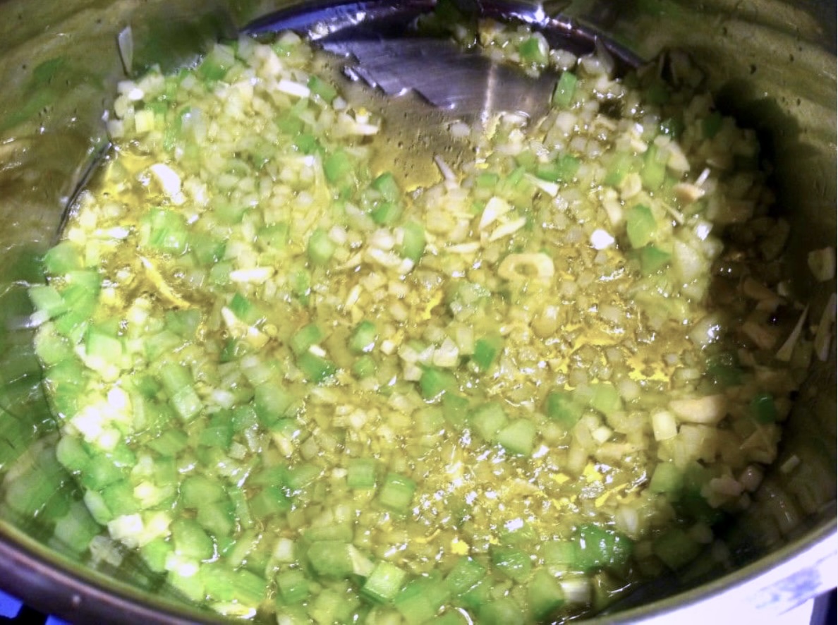 Soffritto: W międzyczasie drobno pokrój w kostkę cebulę, seler naciowy i pozostałe 2 ząbki czosnku. Na drugiej, rozgrzanej patelni z oliwą smaż te warzywa na wolnym ogniu (soffritto) przez około 10 minut, aż zmiękną.