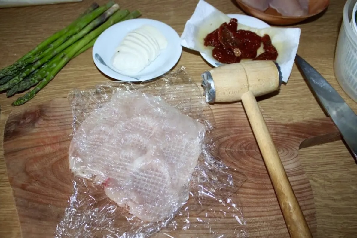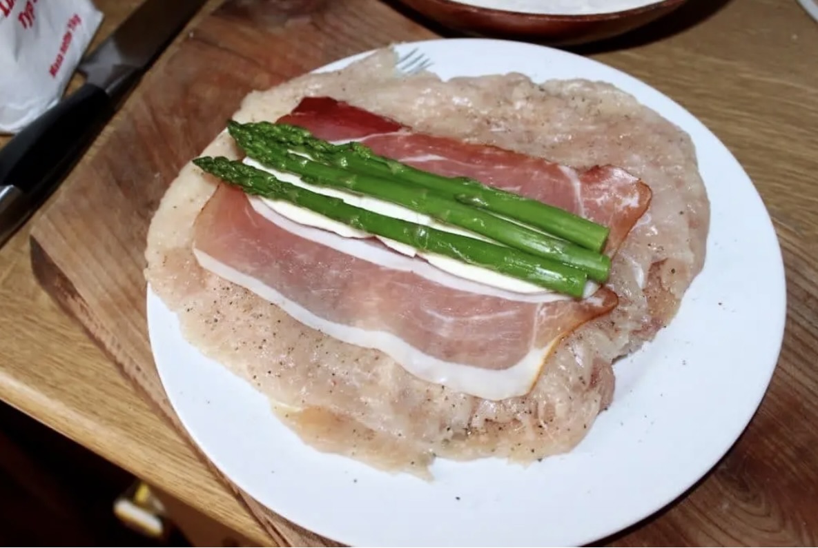 Zwijanie: Na każdym kotlecie ułóż po 2 plastry szynki i plastry mozzarelli. Dodaj po 2-3 szparagi. Zwiń mięso w ciasne roladki, a następnie zabezpiecz sznurkiem kuchennym lub wykałaczkami.