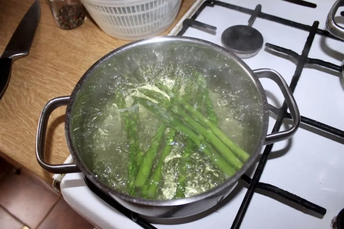 Szparagi: Zblanszuj szparagi we wrzącej, osolonej wodzie przez 3 minuty. Następnie przelej je zimną wodą, aby zachowały kolor i jędrność.