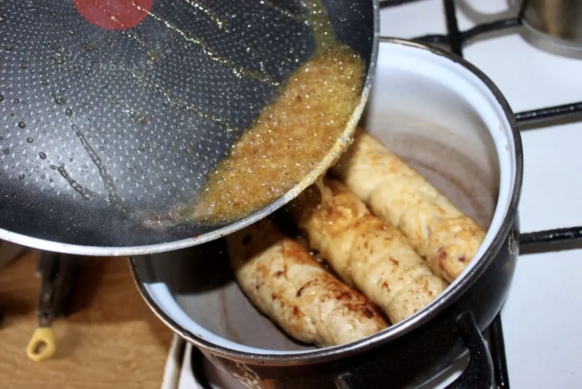 Duszenie: Przełóż roladki do garnka, podlej szklanką gorącej wody (oraz smakiem z patelni po deglasowaniu), a następnie duś pod przykryciem na wolnym ogniu przez około 10 minut.