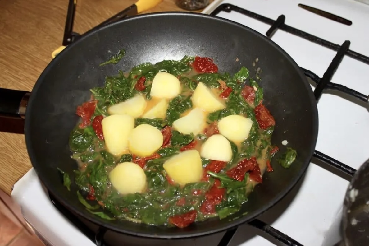 Sos: Na patelni zredukuj wino z bulionem i płynem z duszenia roladek. Dodaj posiekane suszone pomidory, duś chwilę, a następnie wrzuć szpinak. Gdy szpinak zwiędnie, zagęść sos łyżką masła.