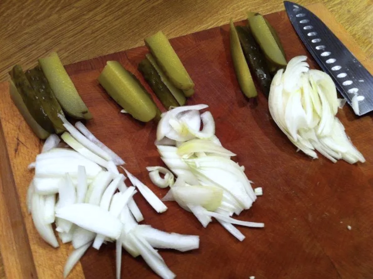 Farsz: Ogórki kiszone pokrój wzdłuż w słupki (można je wcześniej obrać, ale nie jest to konieczne). Cebule obierz i pokrój w piórka.