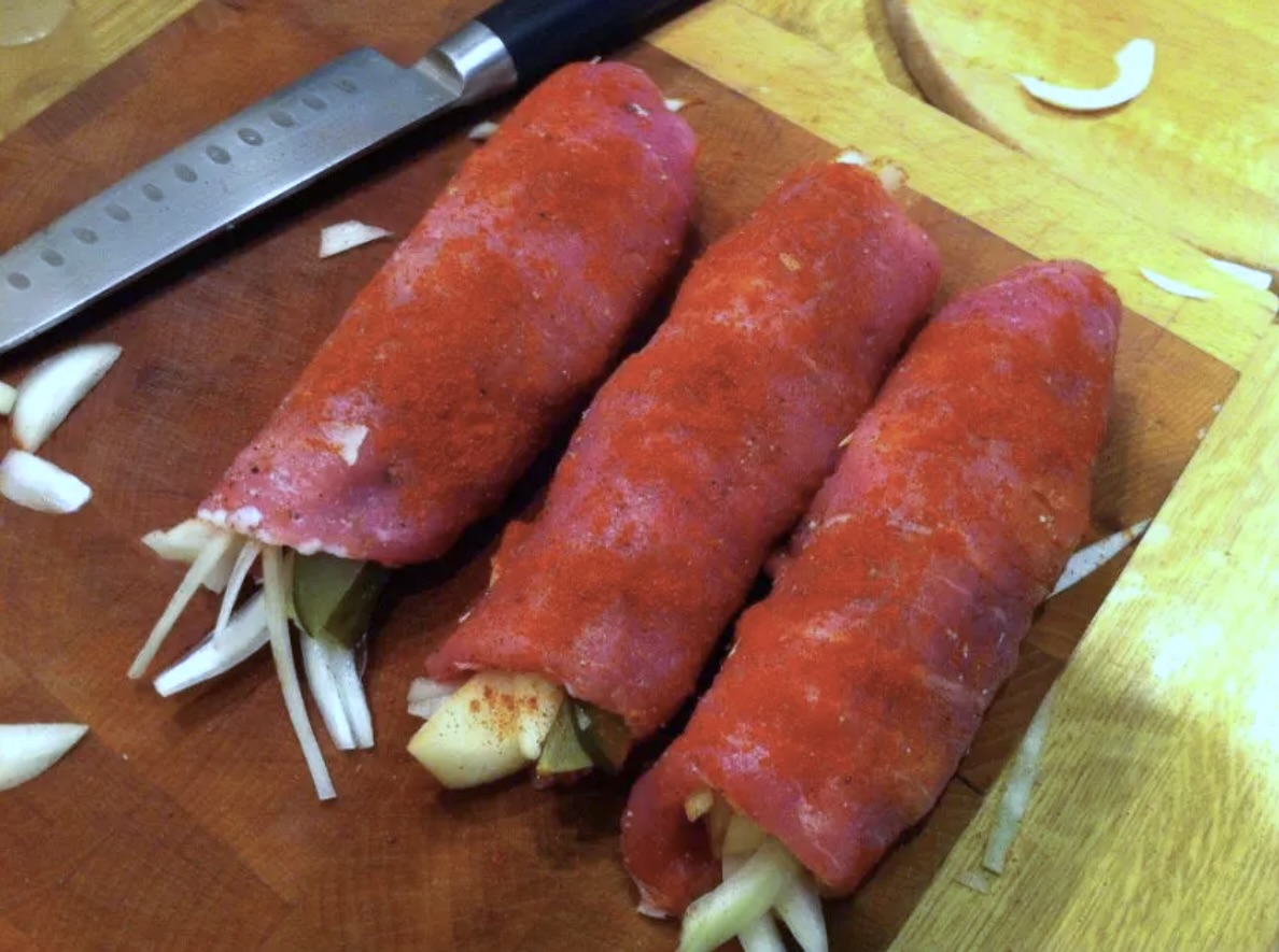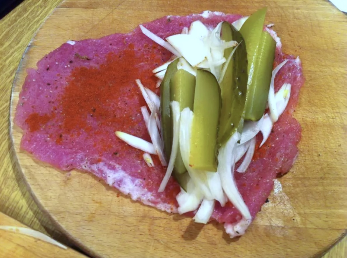 Zawijanie: Na każdy kotlet nałóż kilka piórek cebuli i parę słupków ogórka kiszonego. Zwiń kotleta w roladę i zepnij wykałaczką, aby się nie rozpadła podczas pieczenia.