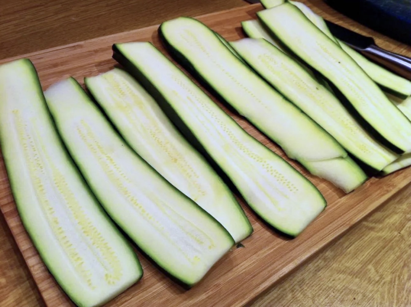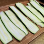 Przygotowanie cukinii: Umyj i dobrze osusz cukinie. Pokrój je wzdłuż w paski o grubości około pół centymetra (można użyć obieraczki do warzyw). Rozłóż paski na kratce, dobrze posól i pozostaw na około 30 minut, aby zmiękły i puściły wodę.