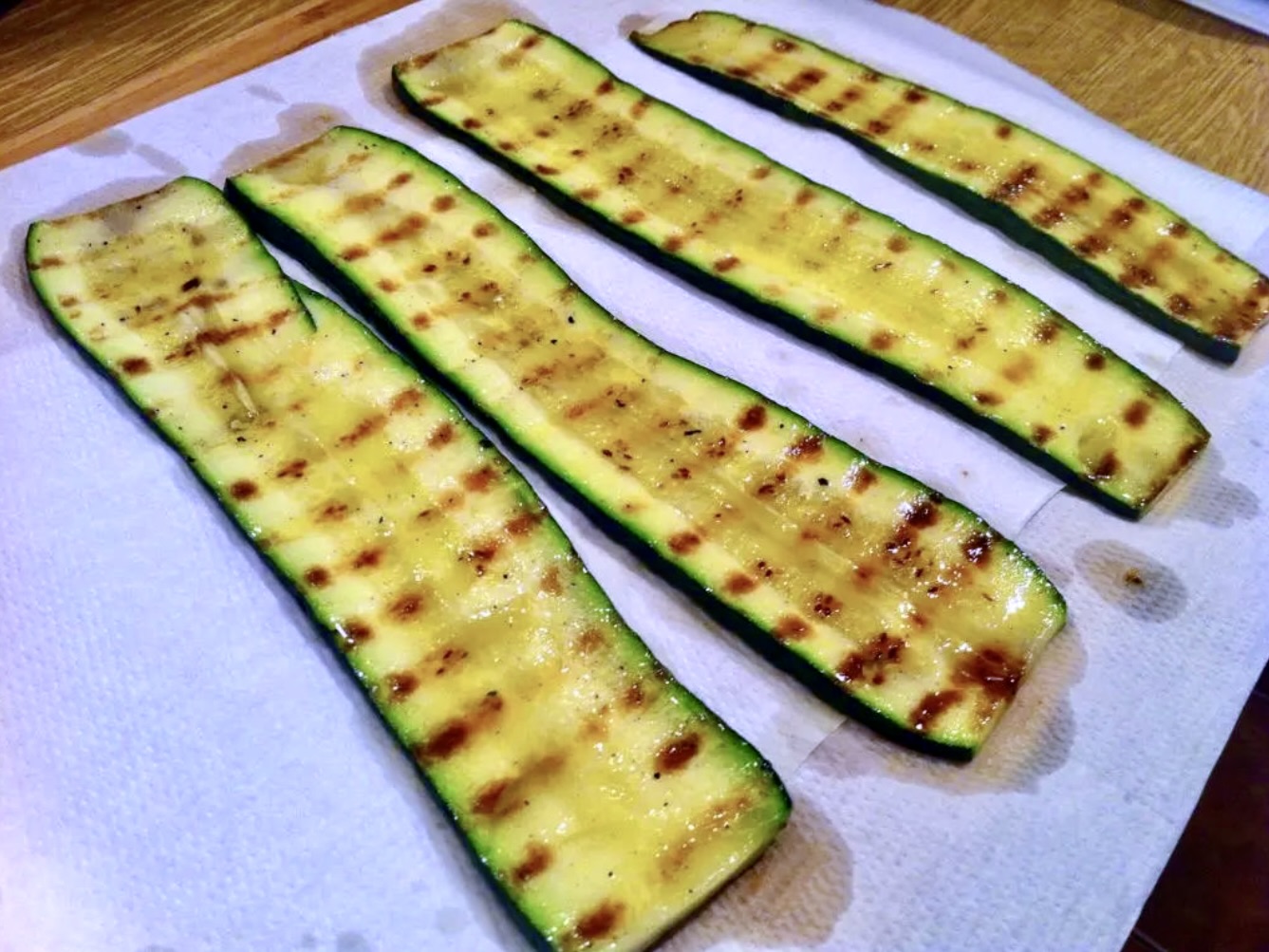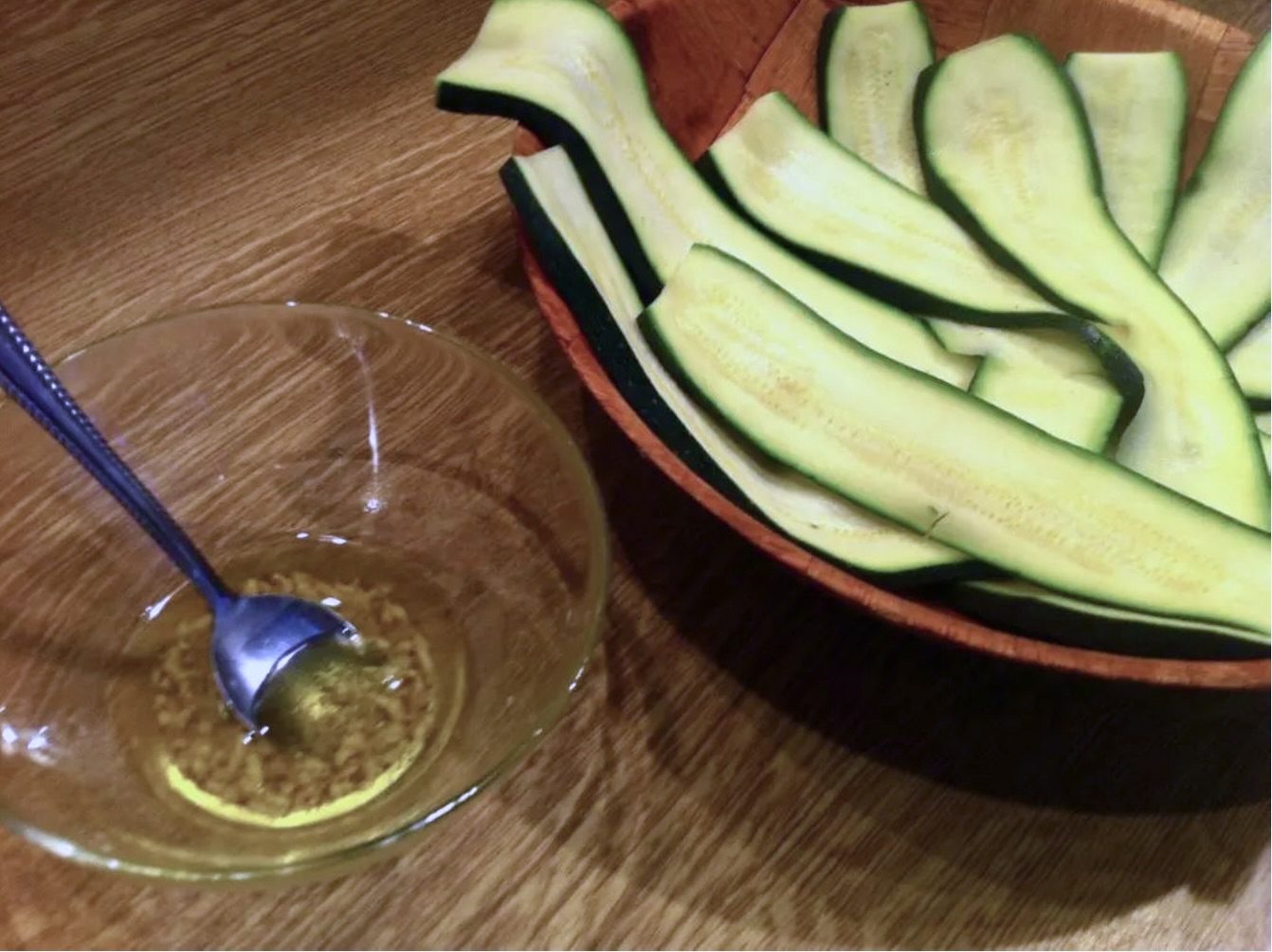 Grillowanie cukinii: Szybko opłucz cukinie pod bieżącą wodą i bardzo dobrze osusz ręcznikiem papierowym. Smaż paski na patelni grillowej (lekko wysmarowanej oliwą) na dość mocnym ogniu. Po odwróceniu na drugą stronę posmaruj cukinie oliwą z czosnkiem.
