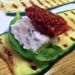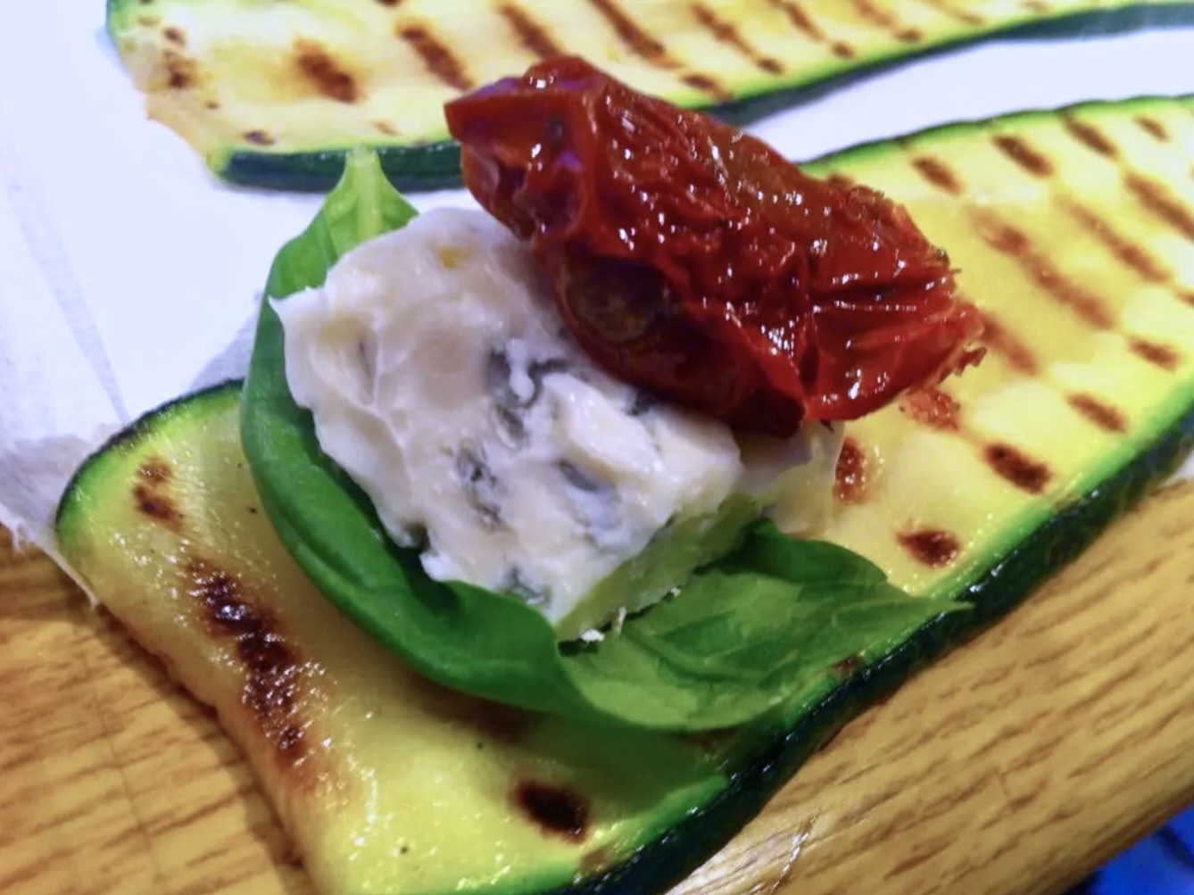 Przygotowanie farszu: Osusz grillowane cukinie z nadmiaru tłuszczu. Gorgonzolę i suszone pomidory (odsączone z oliwy) pokrój na małe kawałki.