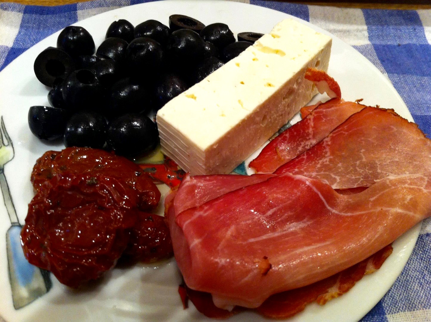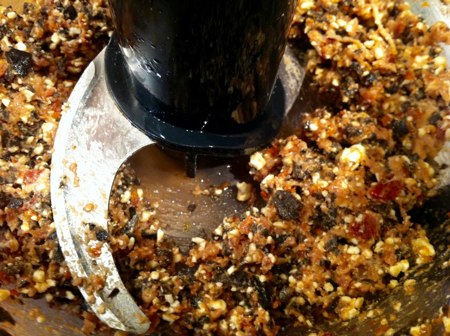 Farsz: Oliwki, suszone pomidory, ser feta oraz szynkę szwarcwaldzką włóż do blendera i zmiksuj na jednolitą masę.