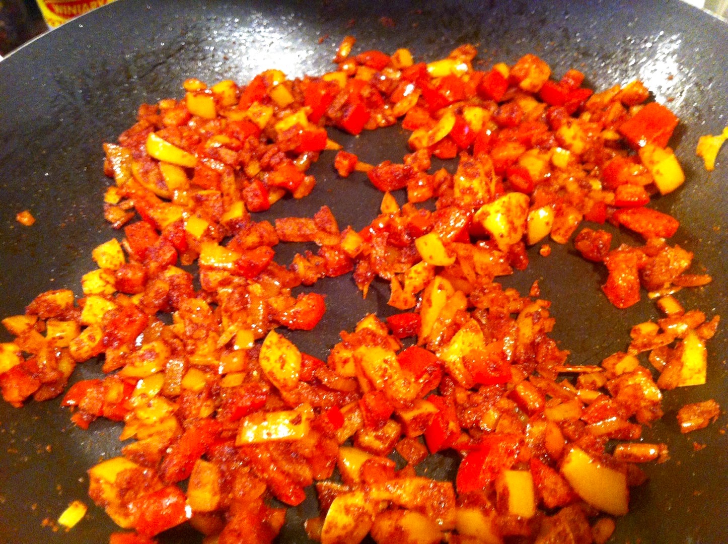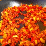 Sos paprykowy: * Cebulę i świeżą paprykę pokrój w drobną kostkę. Smaż na oliwie przez ok. 5 minut.