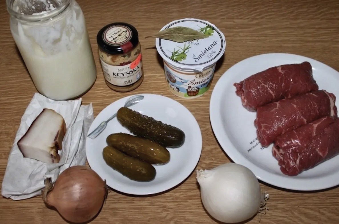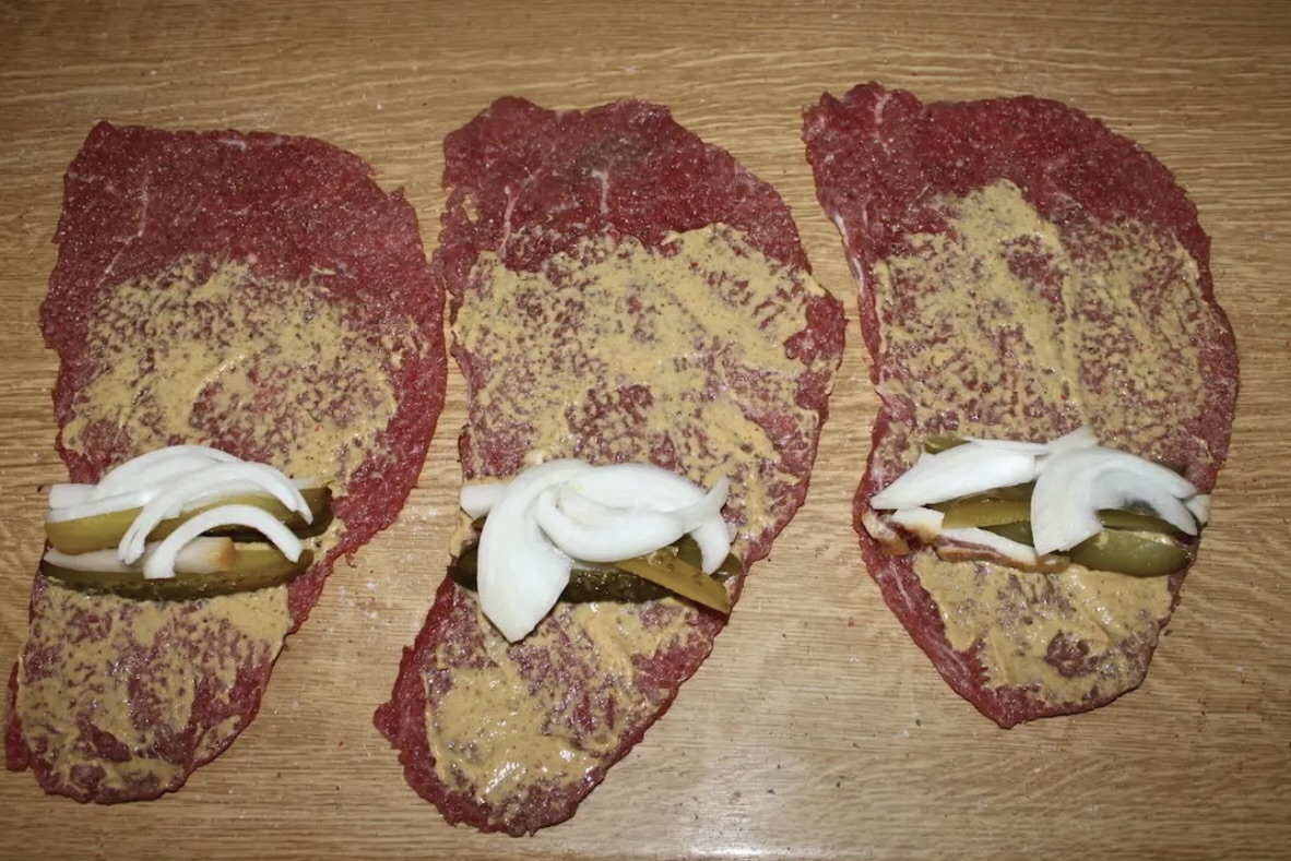 Nadziewanie i zwijanie: Na dolną część każdego płata nałożyć ogórki, słoninę i cebulę. Zwinąć rolady dość ściśle, a boki dobrze zawinąć do środka, aby farsz nie wydostał się podczas obróbki cieplnej (zobacz także przepis na rolady wieprzowe).