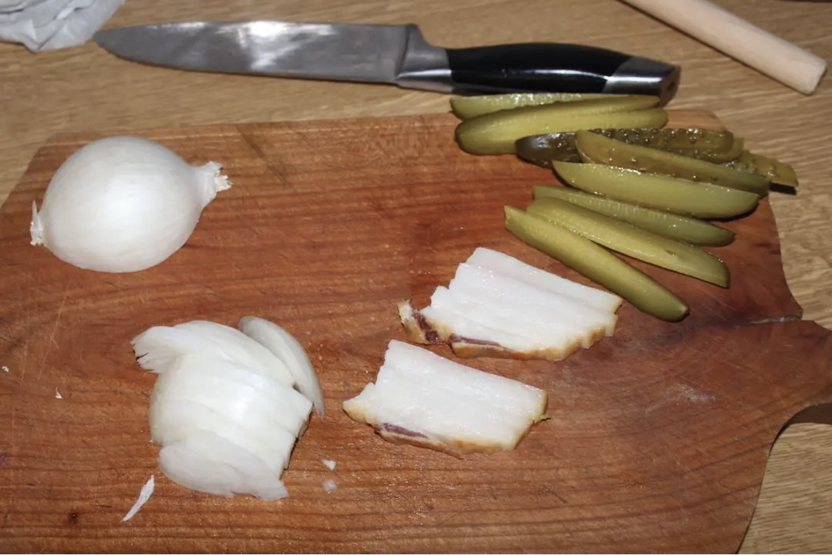 Farsz: Cebulę obrać i pokroić w piórka. Słoninę pokroić w słupki. Ogórki kiszone pokroić wzdłuż na ćwiartki (lub mniejsze kawałki, jeśli są duże).
