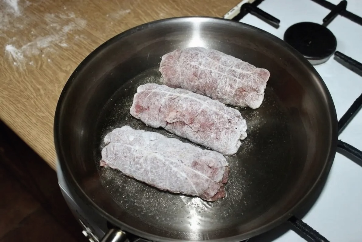 Obsmażanie: Na patelni rozgrzać gęsi smalec (lub inny tłuszcz). Smażyć rolady ze wszystkich stron na mocnym ogniu przez kilka minut, aż ładnie się zrumienią. Porada: Zaleca się użycie patelni bez powłoki teflonowej, aby mięso dobrze się zrumieniło i stworzyło tzw. „smaczek” na dnie.