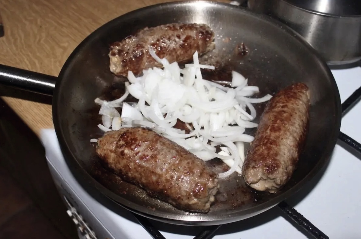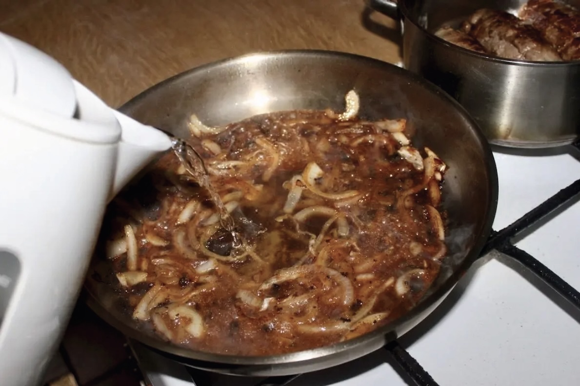 Cebula: Wyjąć rolady z patelni, a następnie przełożyć je do rondelka. Na patelnię wrzucić cebulę pokrojoną w piórka i smażyć, aż będzie mocno zrumieniona, a nawet lekko przypalona (co nada sosowi wyśmienity smak i ciemny kolor).