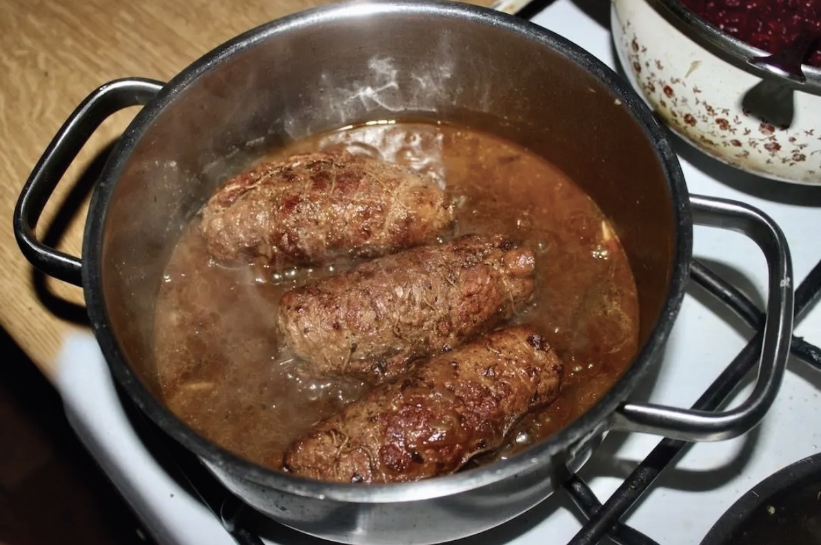 Duszenie: Dolać gorącej wody tak, aby mięso się dusiło, ale nie było jej za dużo (aby sos nie stracił smaku). Dodać listek laurowy i nieco pieprzu. Przykryć i dusić na bardzo wolnym ogniu do miękkości wołowiny, co może zająć nawet do 2 godzin.