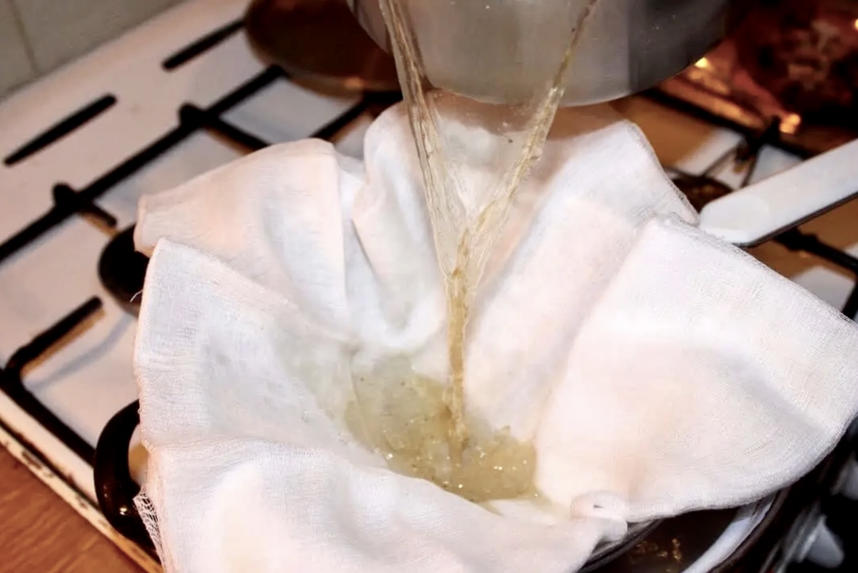 Przelej rosół przez gazę, aby usunąć zanieczyszczenia i uzyskać klarowny bulion.