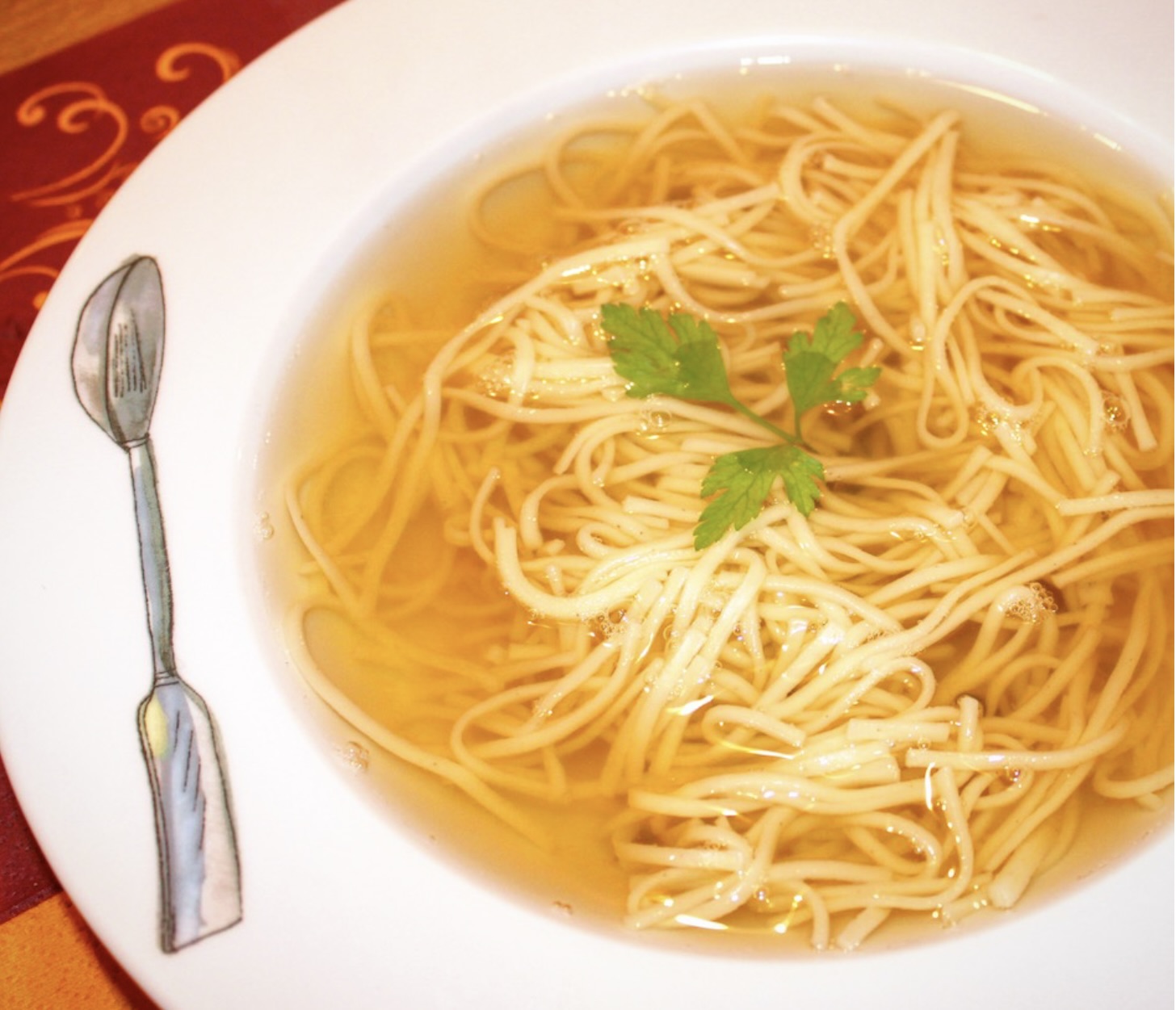 Rosół wołowy z gęsiną podawaj najlepiej z domowym makaronem nitki.