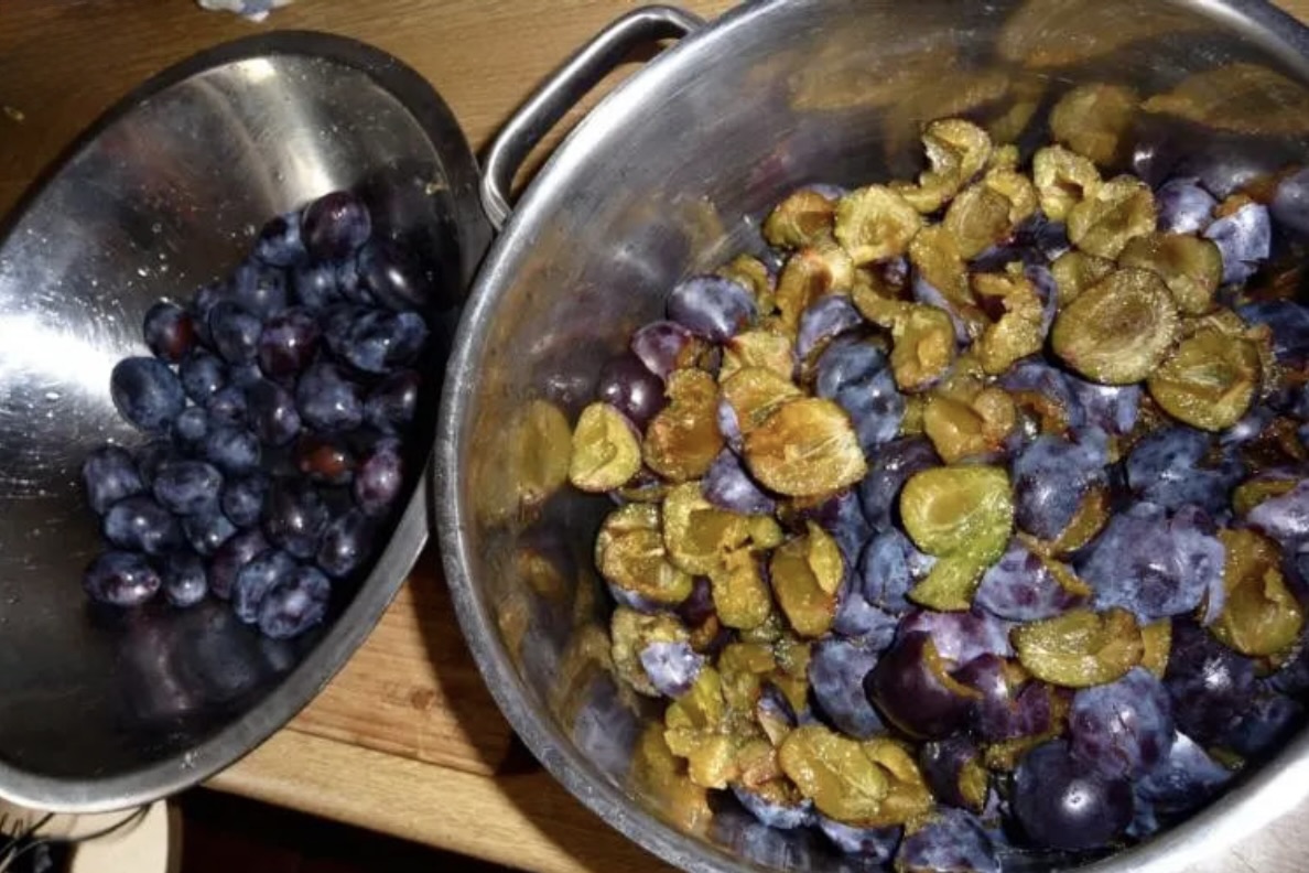 Obróbka śliwek: Śliwki umyj, osusz, przekrój na połówki, a następnie usuń pestki.