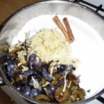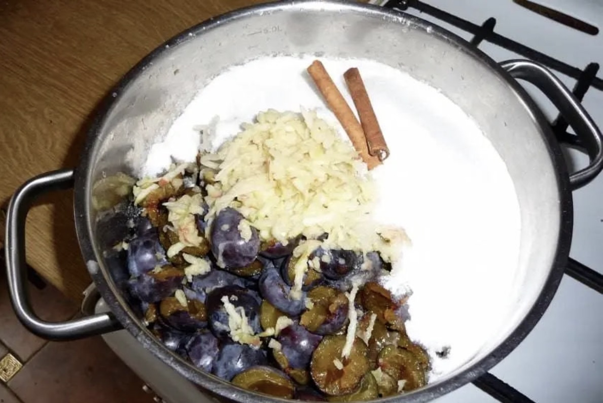 Gotowanie: Przełóż połówki śliwek do garnka. Zasyp cukrem, dodaj 2 laski cynamonu oraz starte na grubych oczkach tarki jabłko. Wlej szklankę wody i postaw na gazie.