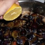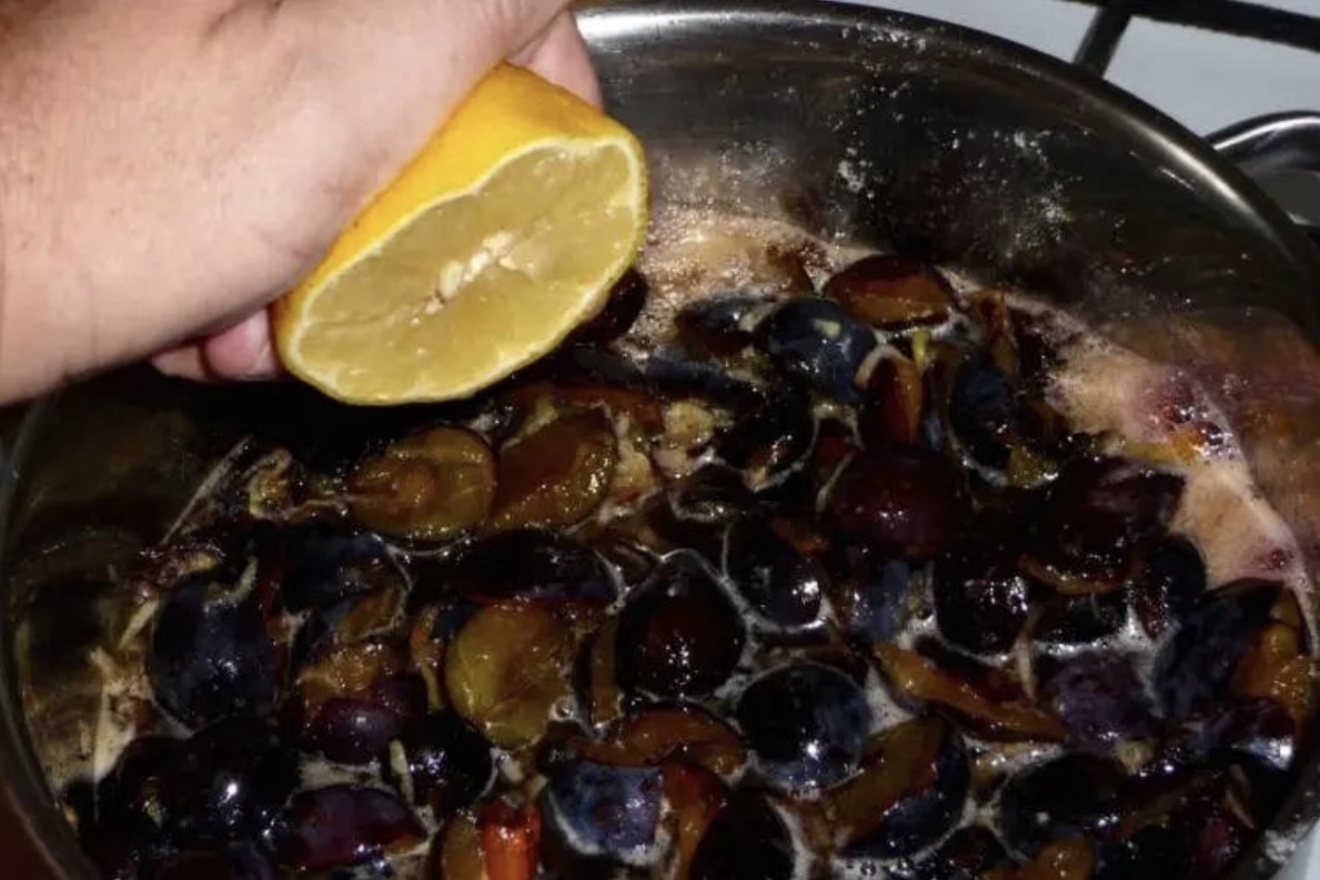 Doprawianie cytryną: Wyciskaj sok z cytryn do garnka i próbuj. Smak powinien być wyważony pomiędzy słodkim a kwaśnym. Należy próbować sok razem z kawałkiem śliwki. W przepisie użyto soku z aż trzech cytryn.