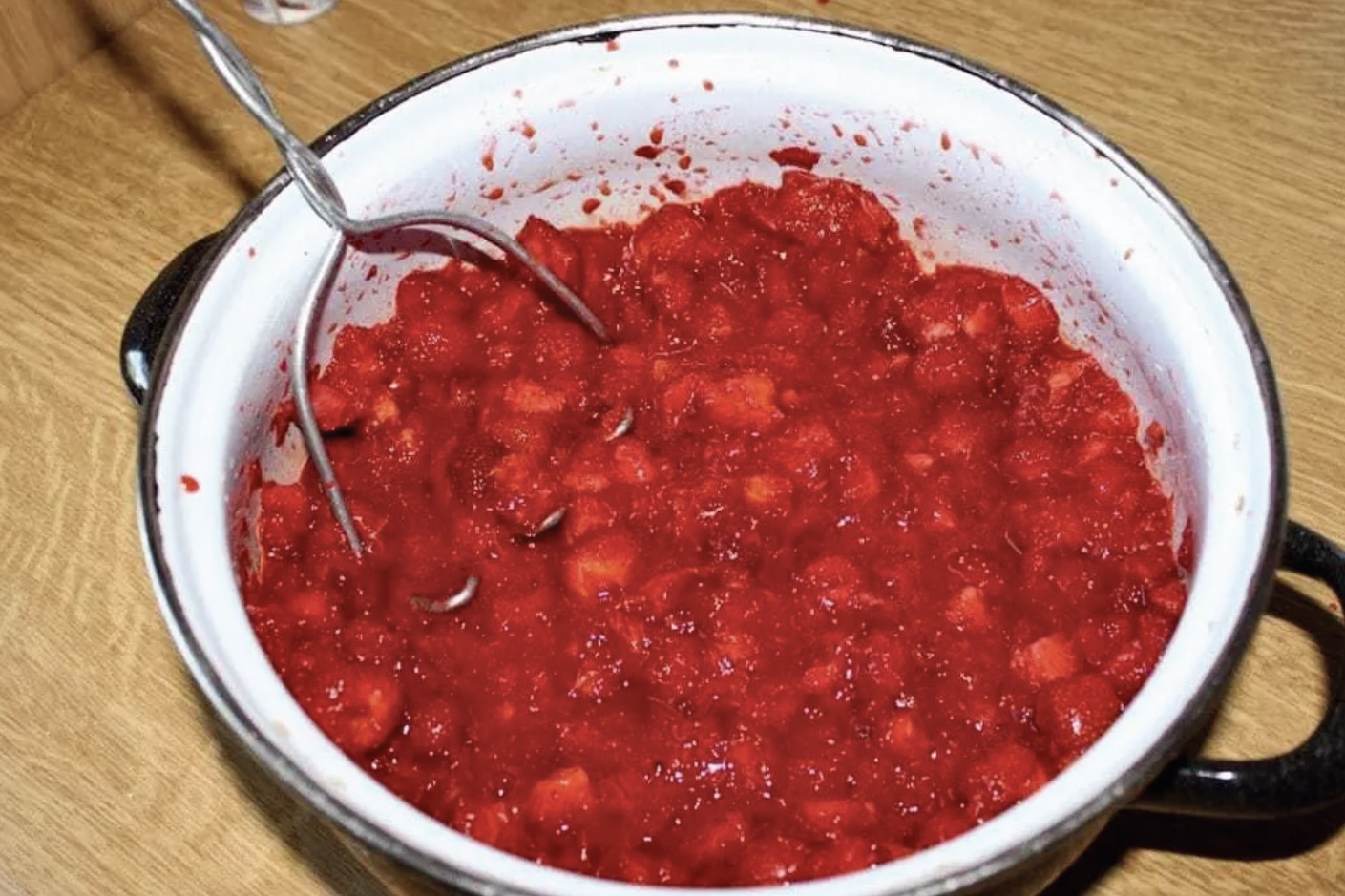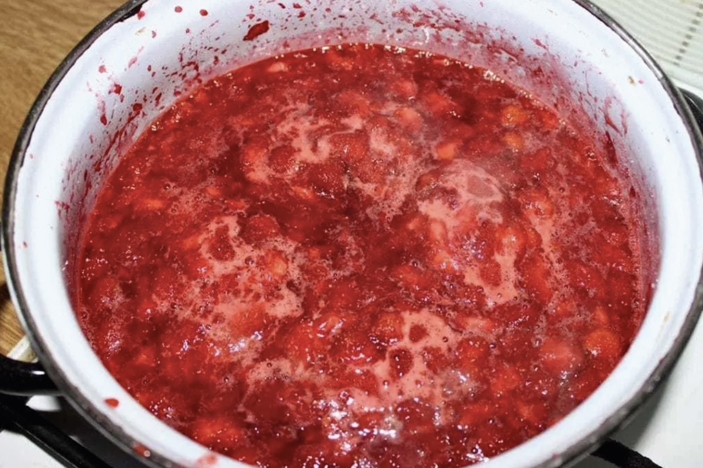 Rozdrobnienie: Owoce włóż do dużego garnka i ugnieć praską do ziemniaków, tak aby tylko część z nich pozostała niemal w całości. Ten zabieg ma sprawić, że truskawki puszczą więcej soku.