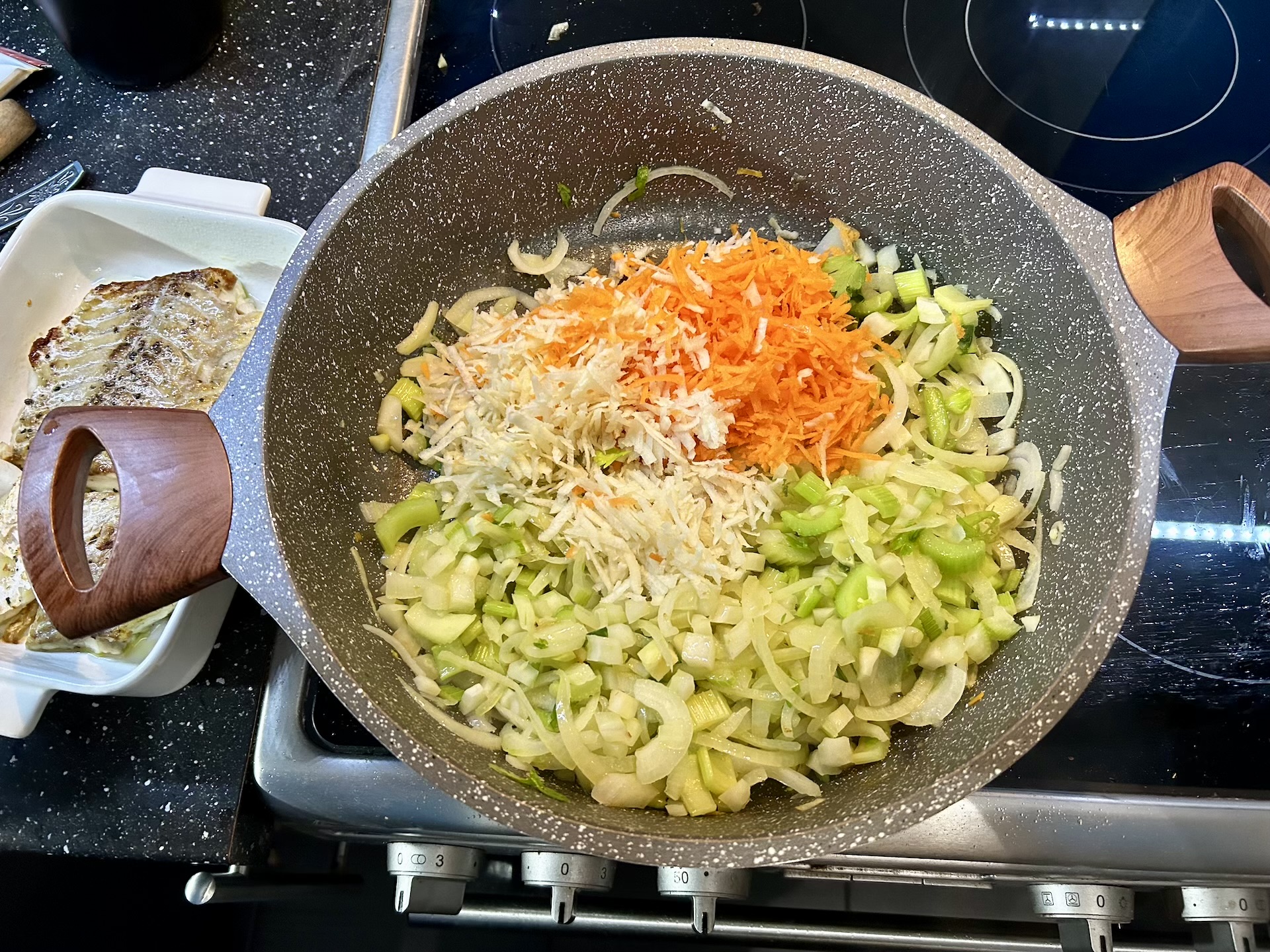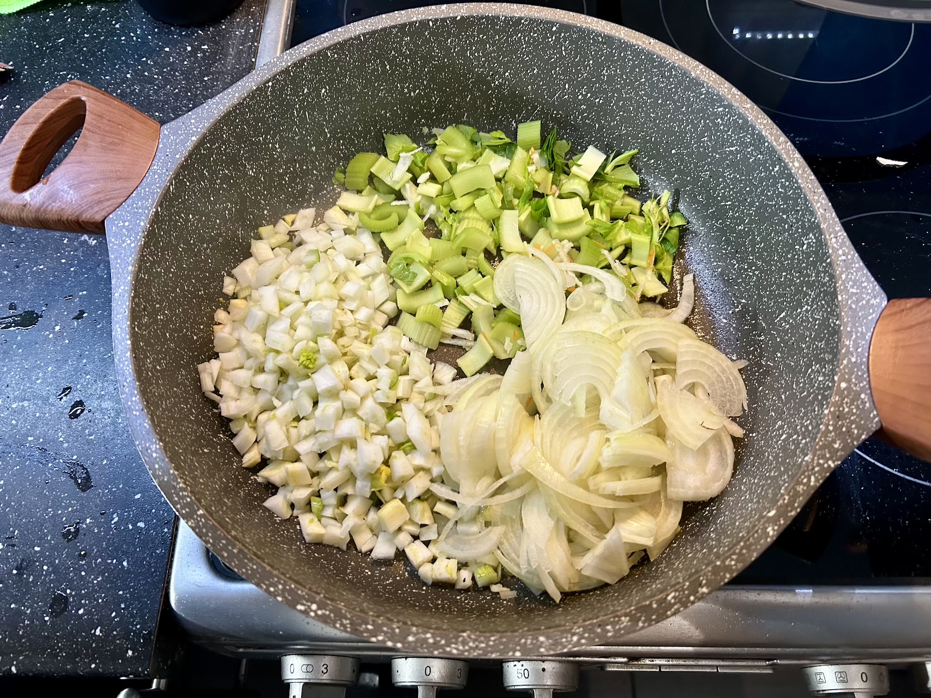 Wlej oliwę na patelnię i gdy się lekko podgrzeje, wrzuć pokrojony fenkuł, seler naciowy i cebulę.