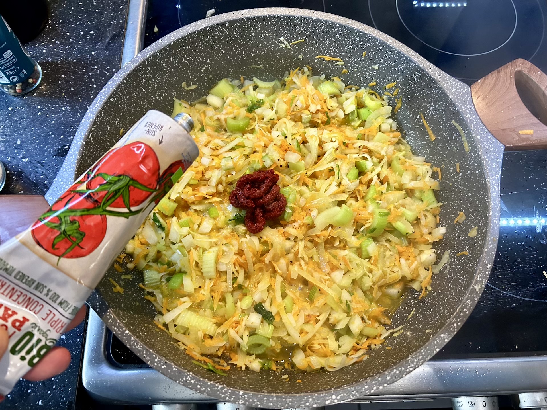 Dodaj jedną kopiastą łyżeczkę koncentratu pomidorowego. Dobrze wymieszaj i smaż 1-2 minuty, uważając, aby się nie przypaliły (uwaga: nie przesadź z ilością koncentratu, aby nie zdominował smaku).