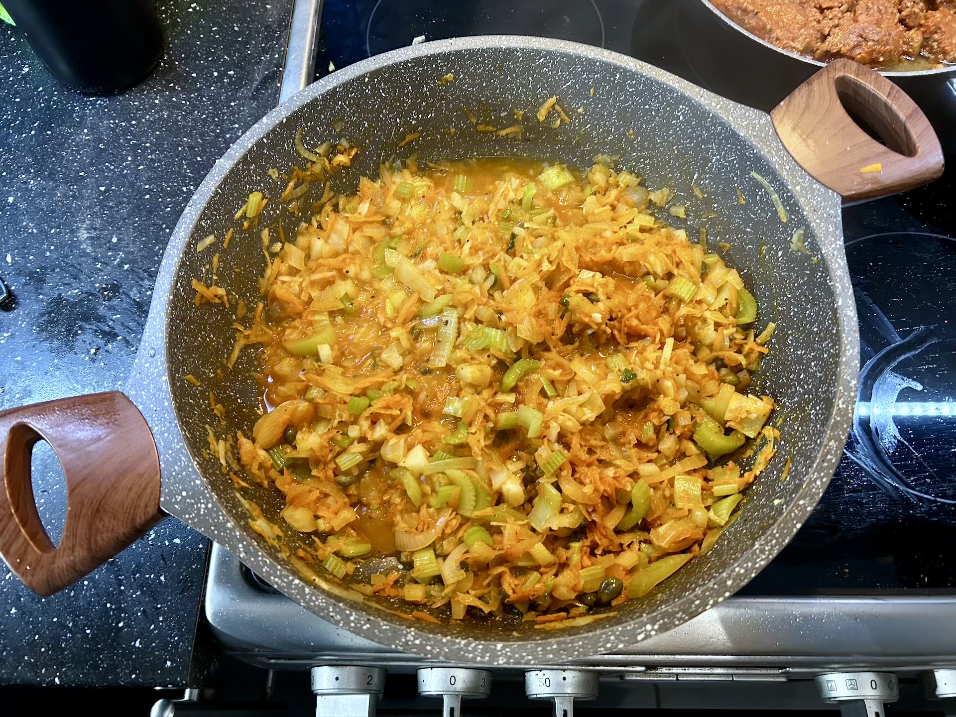 Dodaj starte marchewki i pietruszki. Smaż całość jeszcze chwilę, aż warzywa nieco zmiękną.