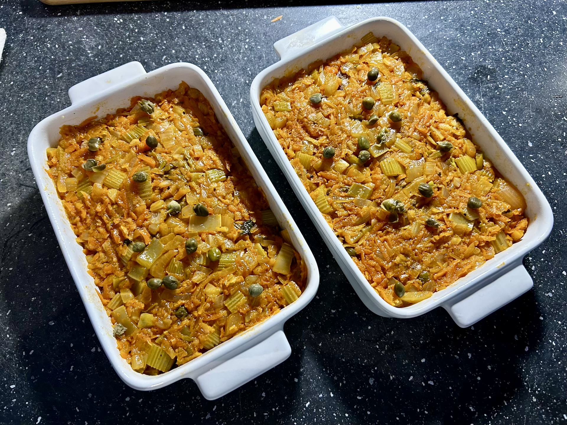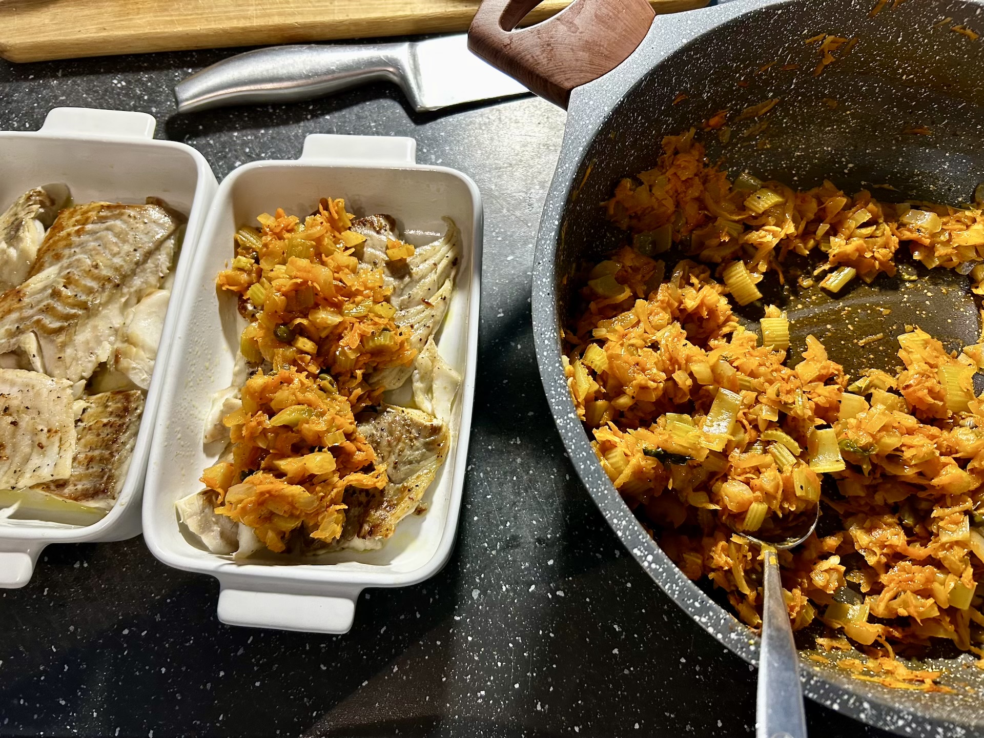 Na rybie rozłóż uduszone warzywa, a następnie wyrównaj powierzchnię.