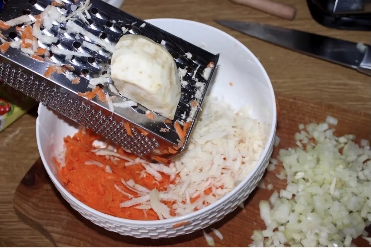 Warzywa korzeniowe (marchew, pietruszkę, seler) zetrzyj na grubych oczkach tarki.