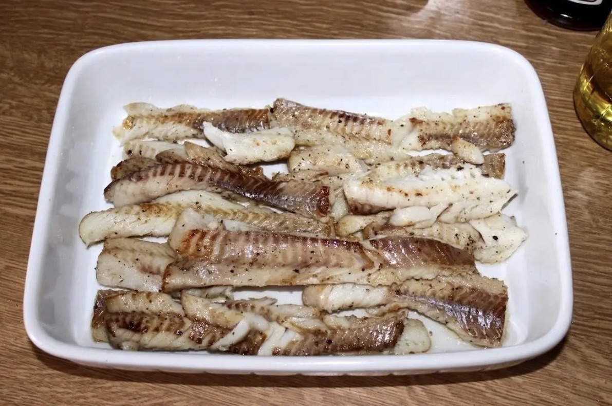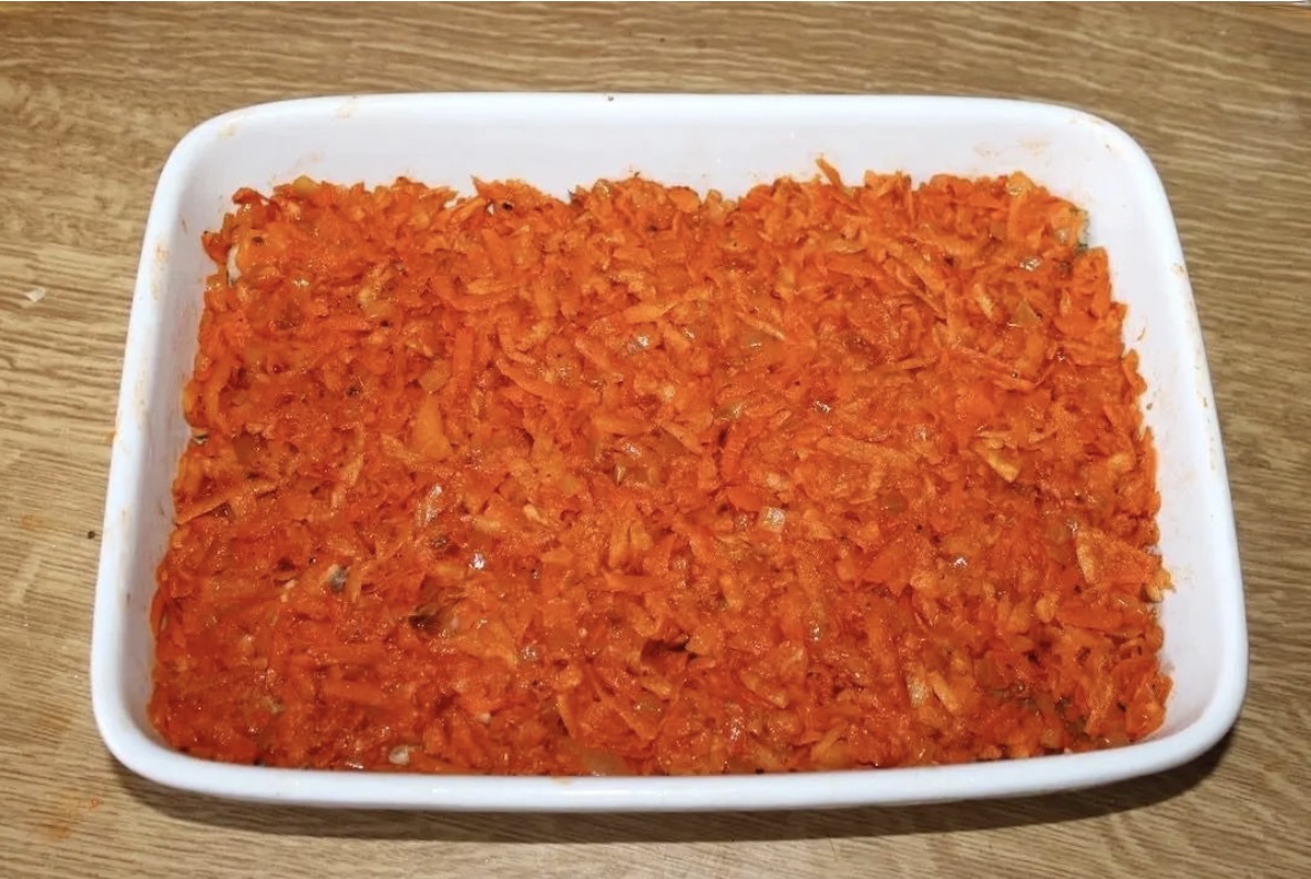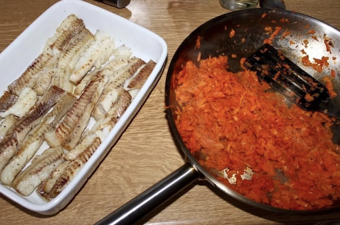 Usmażoną rybę ułóż na dnie naczynia (nie przejmuj się, jeśli filety się rozpadną).