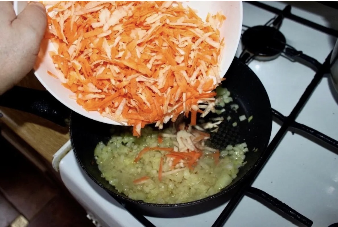 Na patelni rozgrzej masło klarowane, zeszklij cebulę, a następnie dodaj starte warzywa.