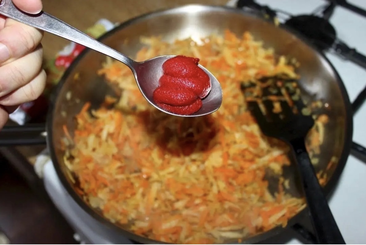 Dodaj koncentrat pomidorowy i duś przez kolejne 5 minut. Warzywa powinny być „al dente” (miękkie, ale nie rozgotowane).