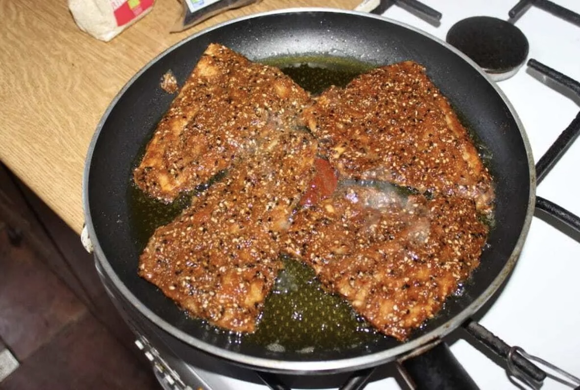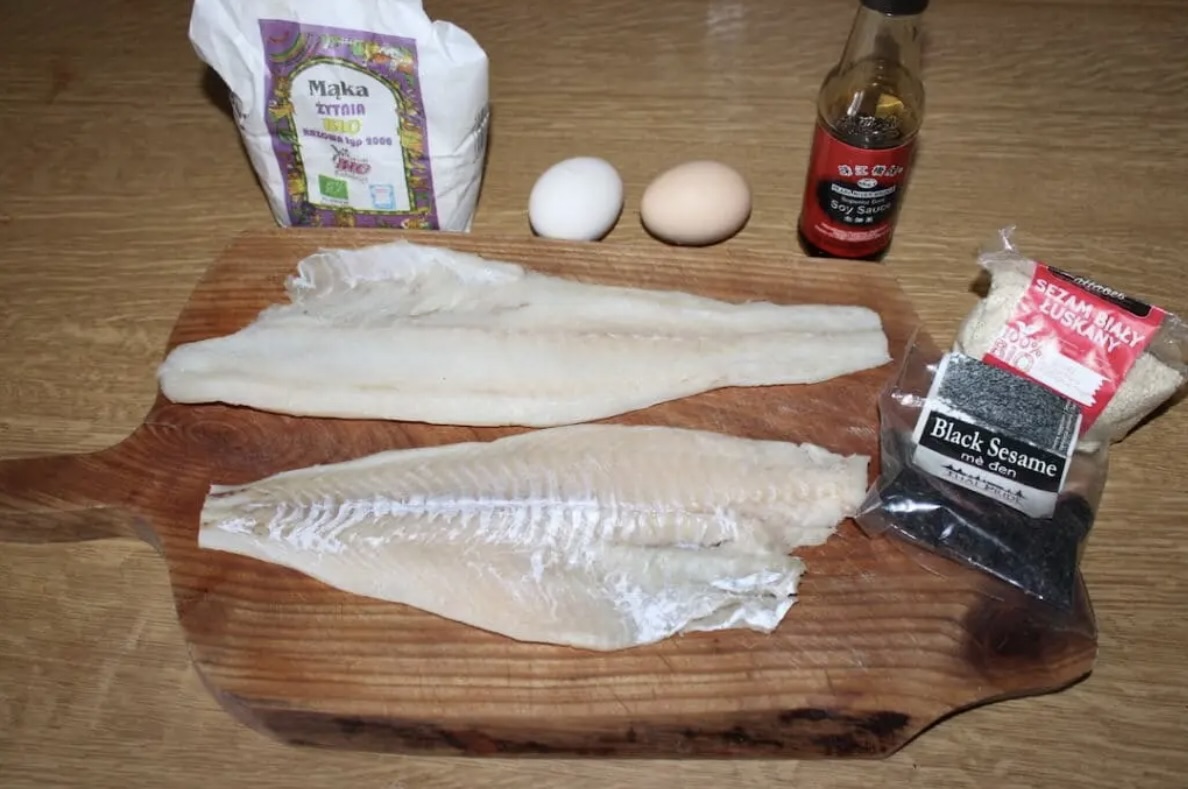 Przygotowanie ciasta (panierki): Do miski wbij jajka, wlej 1 łyżkę sosu sojowego i wsyp sezam (czarny i biały). Dodaj 2-3 garści mąki żytniej razowej typ 2000. Wymieszaj. Ciasto powinno być dość gęste, aby nie spływało z ryby. Pamiętaj, że mąka żytnia razowa szybko gęstnieje.