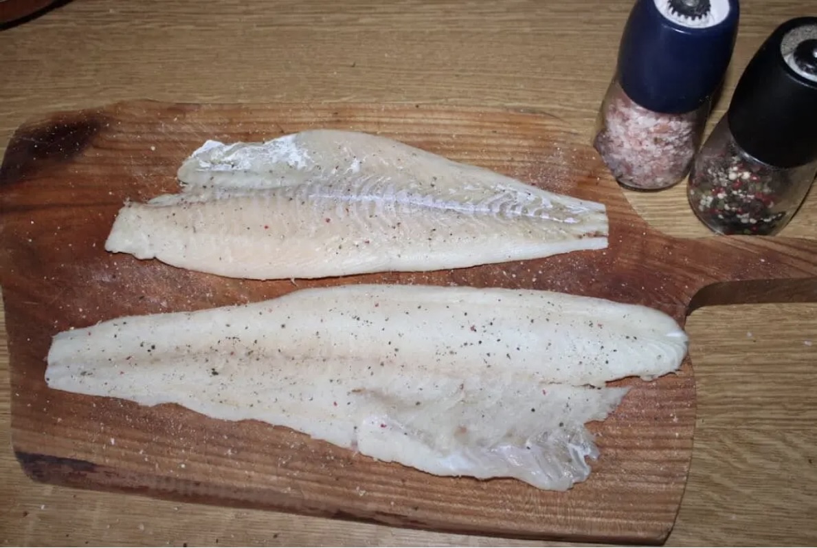 Przygotowanie ryby: Rybę pozbaw ości, dokładnie umyj i osusz ręcznikami papierowymi. Następnie posól i posyp świeżo zmielonym pieprzem. Duże filety (np. po 250 gramów) zaleca się przeciąć na dwie części dla wygody obróbki.