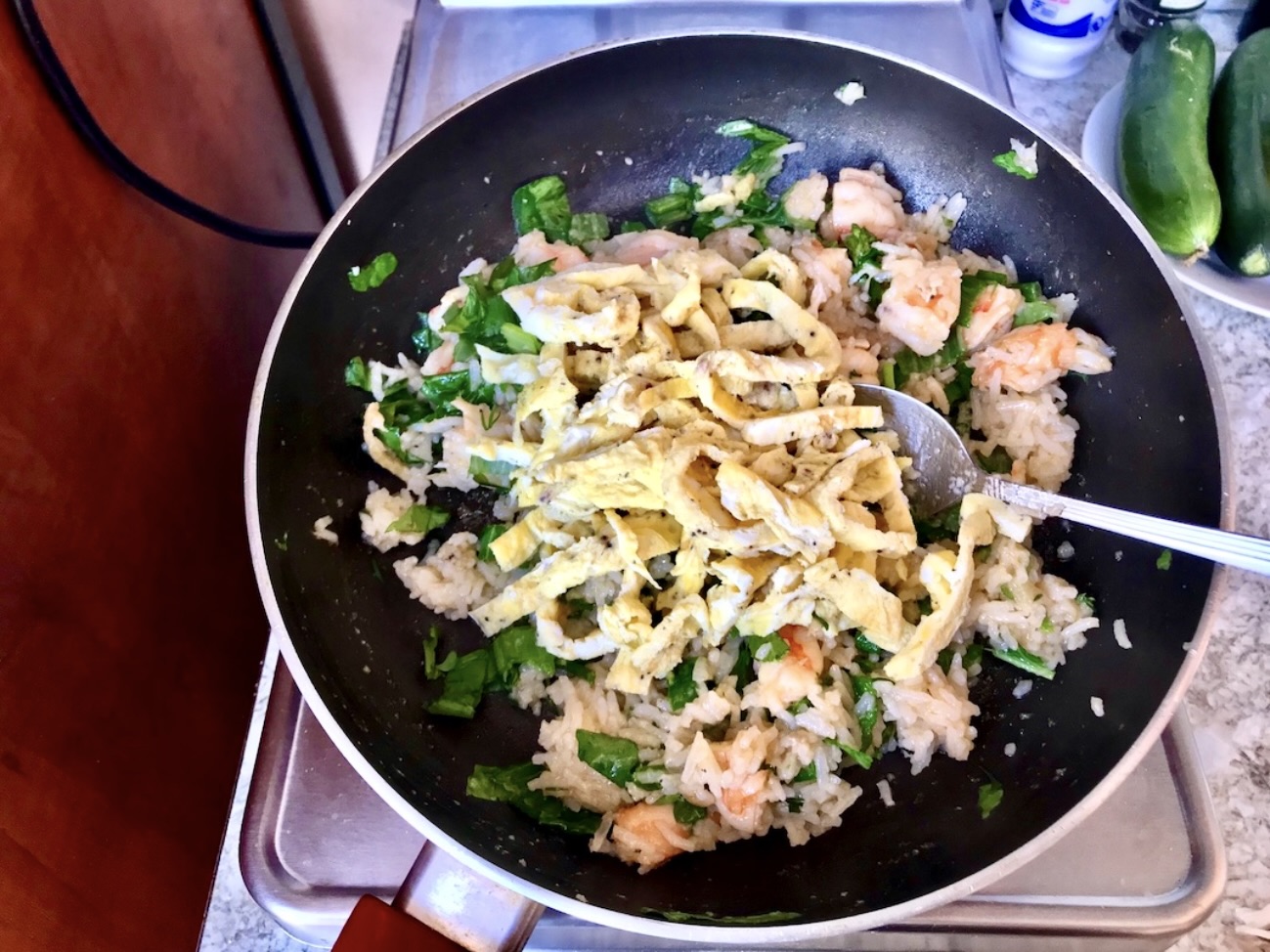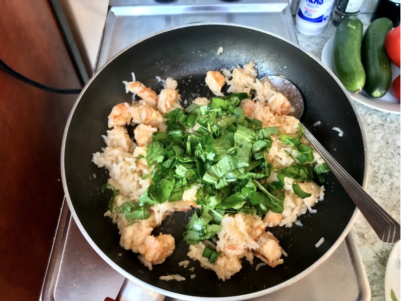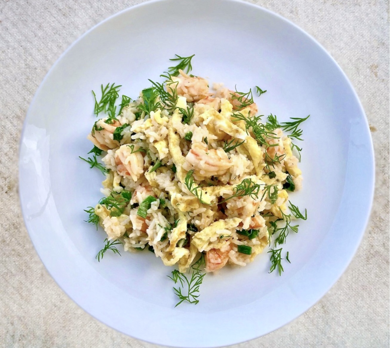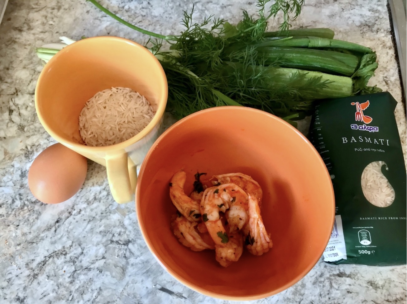 Ryż smażony z krewetkami jest kolejnym przykładem na zgrabne i smaczne połączenie składników, które można znaleźć w naszych lodówkach. Tym razem wykorzystałem ryż z dnia poprzedniego oraz kilka usmażonych krewetek, które również „nie załapały się” na obiad dzień wcześniej. Świeżych ziół zawsze mam pod dostatkiem, podobnie jak i jajek. Aż prosi się o przyrządzenie smacznego dania z tych składników. I takie to danie jest. Zapewniam, że smakuje wybornie.