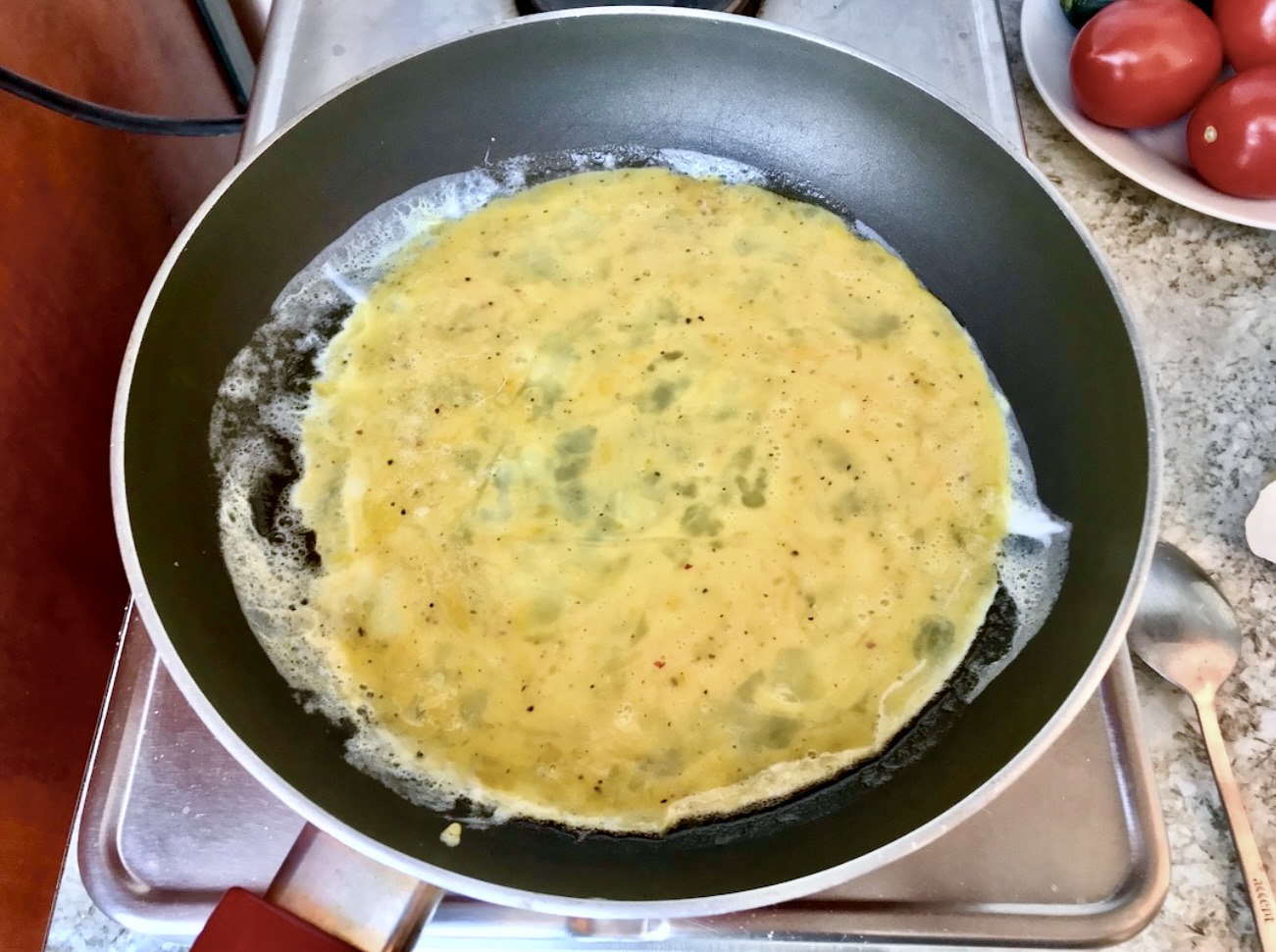 Wlej rozkłócone jajka. Smaż krótko omleta na średnim ogniu z obu stron.