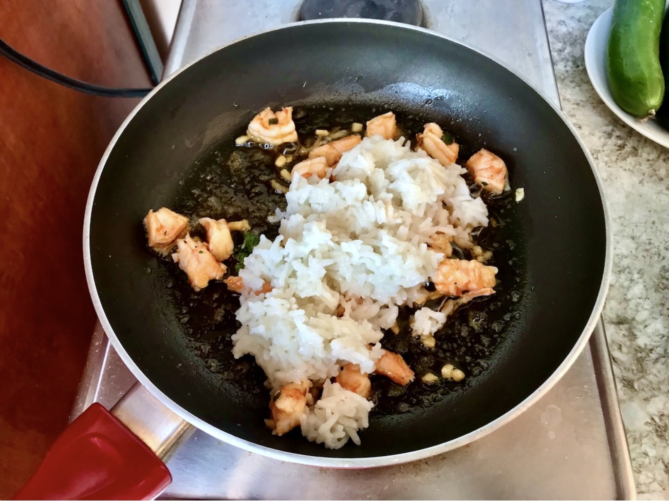 Po minucie dodaj na patelnię ugotowany, przestudzony ryż.