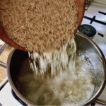 Gotowanie ryżu: Wlej bulion do garnka, zagotuj go i wsyp ryż. Gotuj na średnim ogniu przez około 10 minut, aż większość płynu odparuje. Następnie przykryj garnek, wyłącz gaz i odstaw, aby ryż „doszedł” i wchłonął resztę bulionu.
