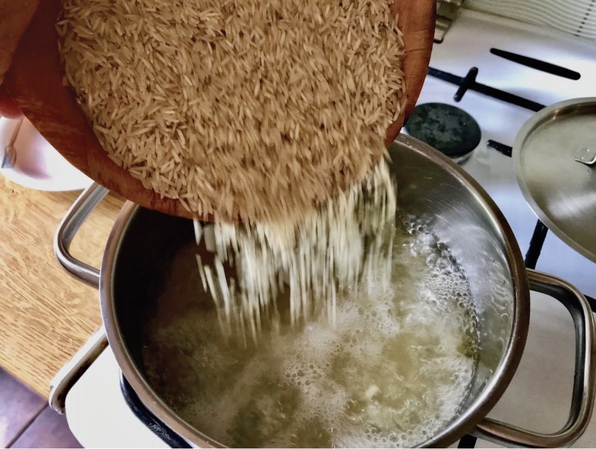 Gotowanie ryżu: Wlej bulion do garnka, zagotuj go i wsyp ryż. Gotuj na średnim ogniu przez około 10 minut, aż większość płynu odparuje. Następnie przykryj garnek, wyłącz gaz i odstaw, aby ryż „doszedł” i wchłonął resztę bulionu.