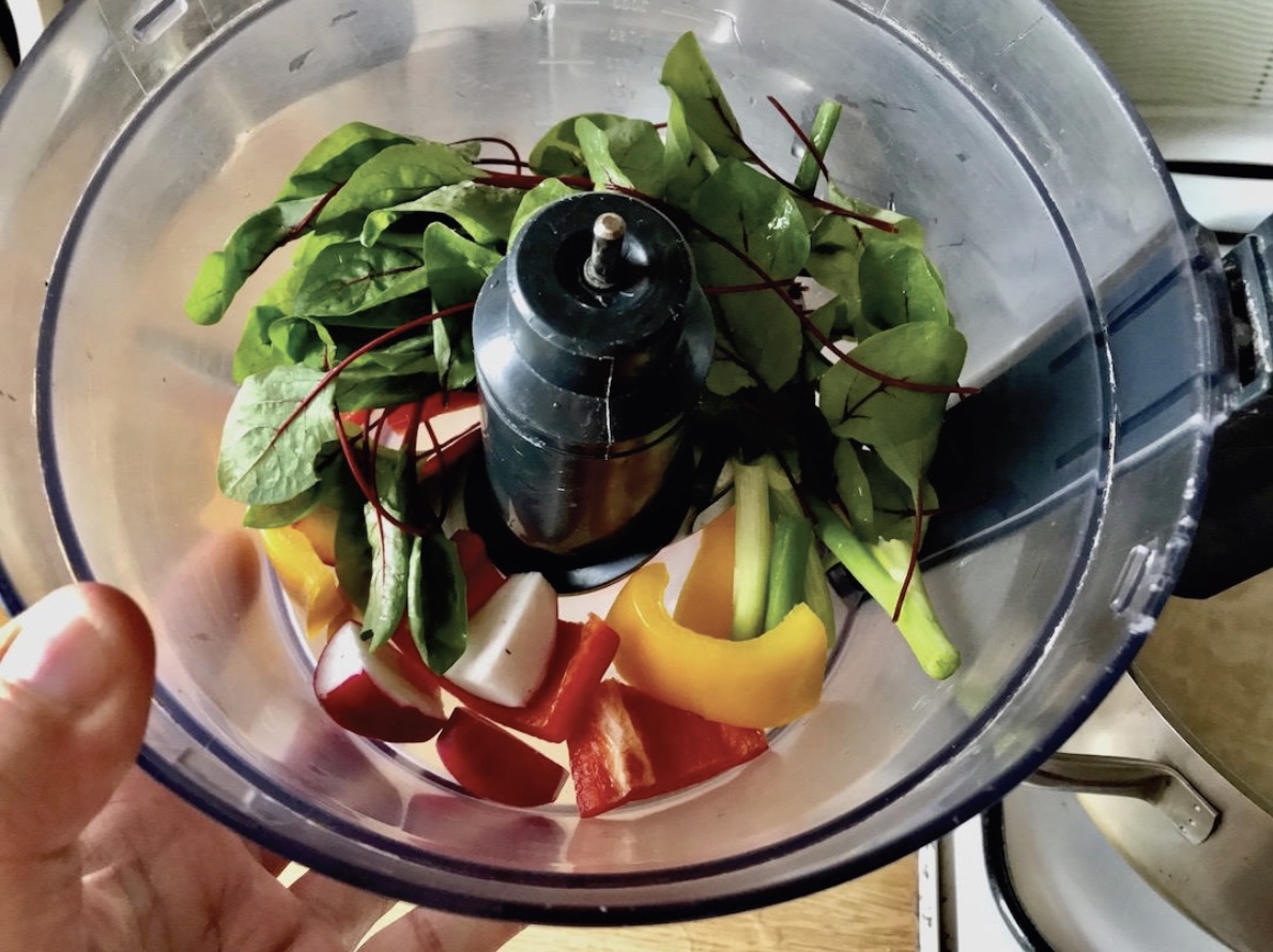 Umyte i osuszone warzywa zmiksuj pulsacyjnie w malakserze przez krótką chwilę (mają być w małych kawałkach, a nie w formie papki).