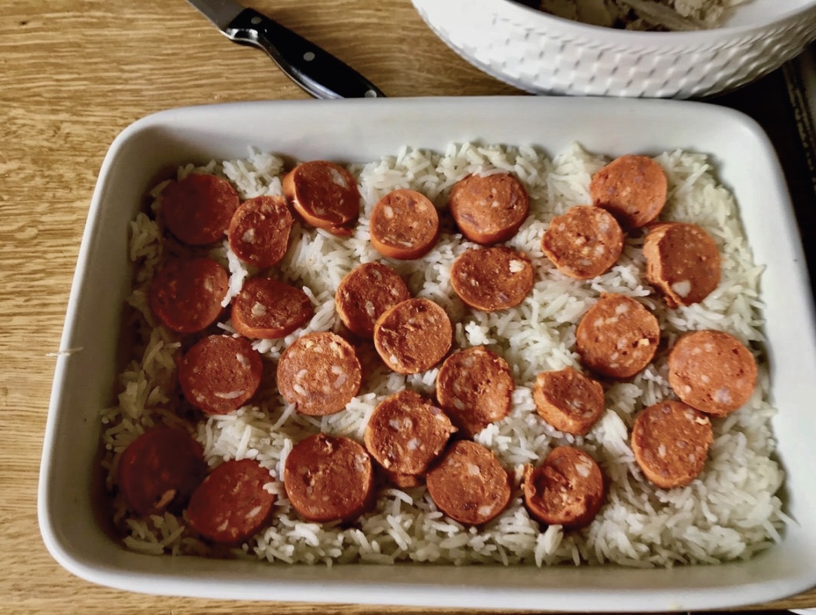 Na ryż wyłóż warstwę kiełbasy, a następnie warstwę kurczaka.